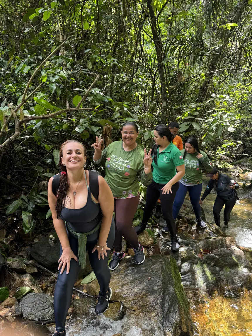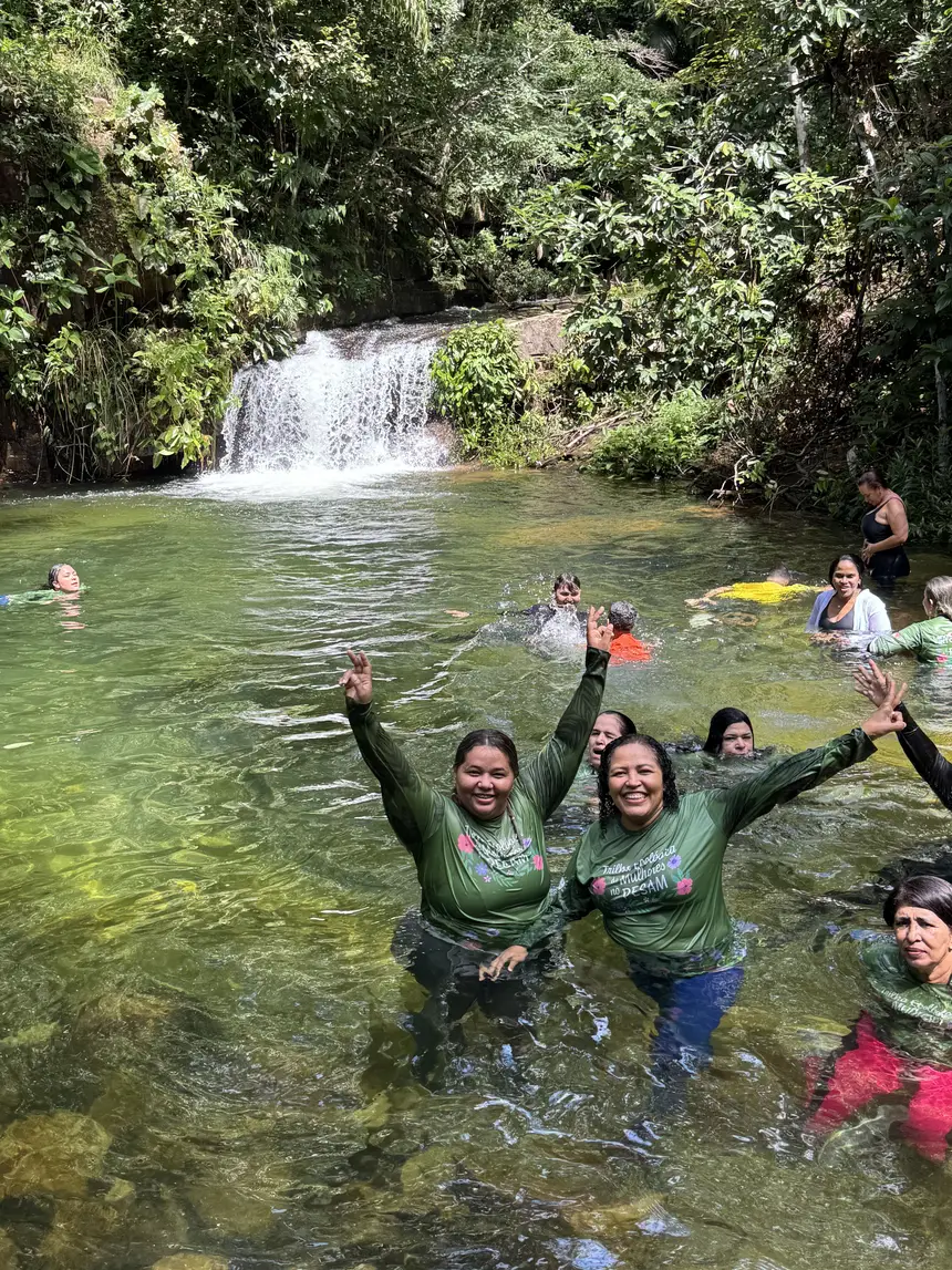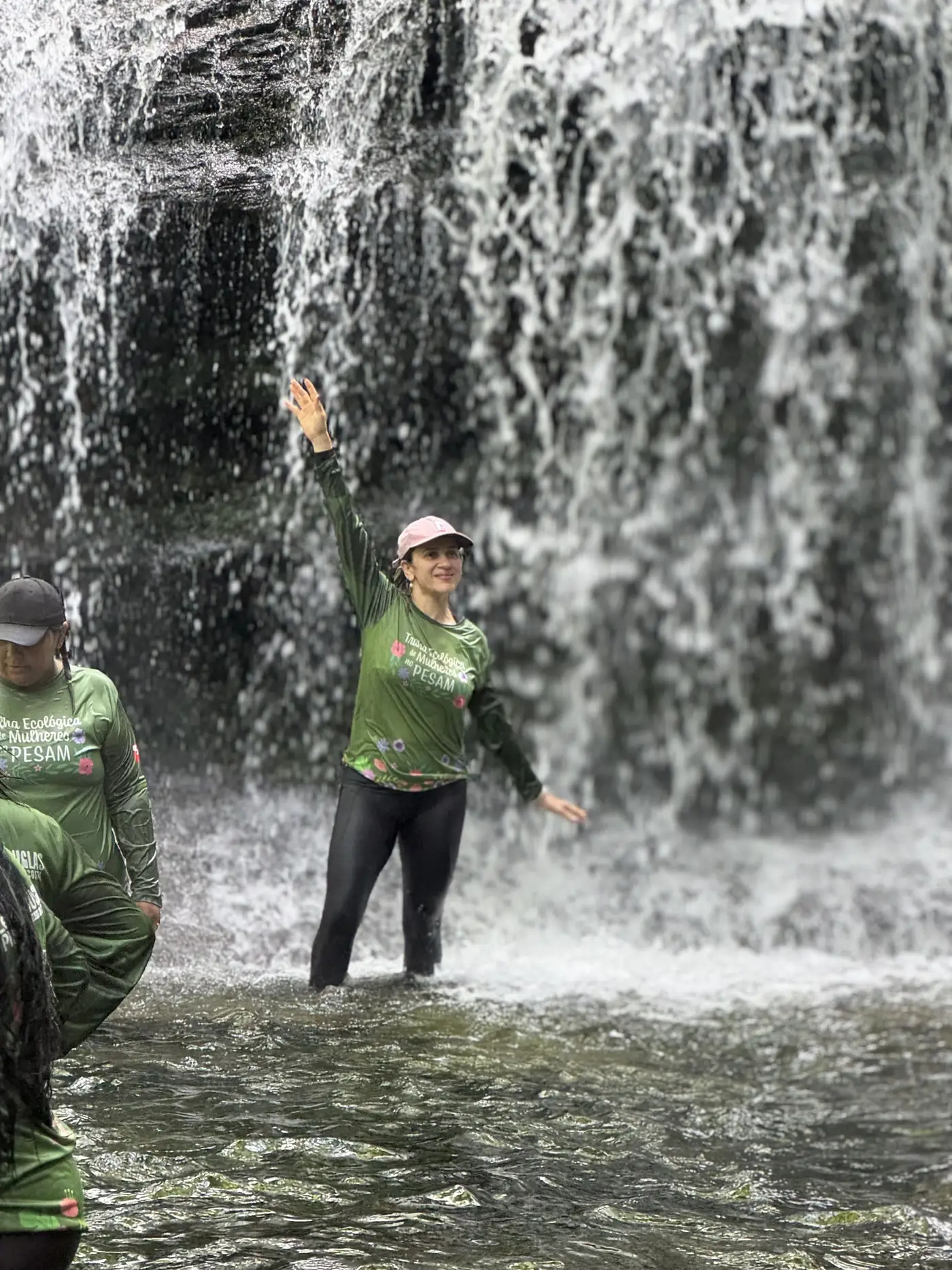 Por volta das 9h, o grupo partiu em direção ao Parque Estadual. Ao chegarem, as participantes fizeram o aquecimento, um cuidado que reflete a essência do evento: antes de cuidar de outros, é preciso cuidar de si. Com energia renovada, elas iniciaram a caminhada de aproximadamente 2,5 quilômetros pela trilha ecológica, rumo a dois dos atrativos do Pesam: a Cachoeira Vargem Grande e o Poção do Antônio Crente, cujas águas cristalinas e paisagem exuberante foram o cenário perfeito para a celebração.