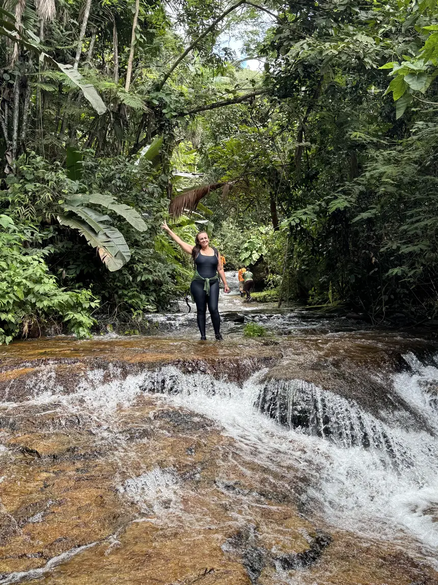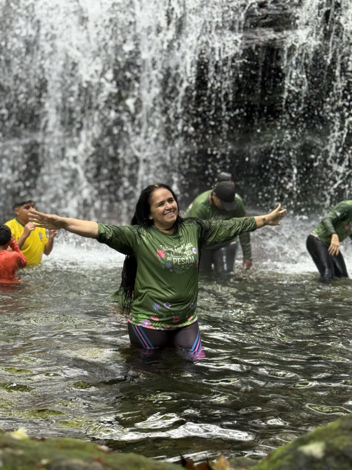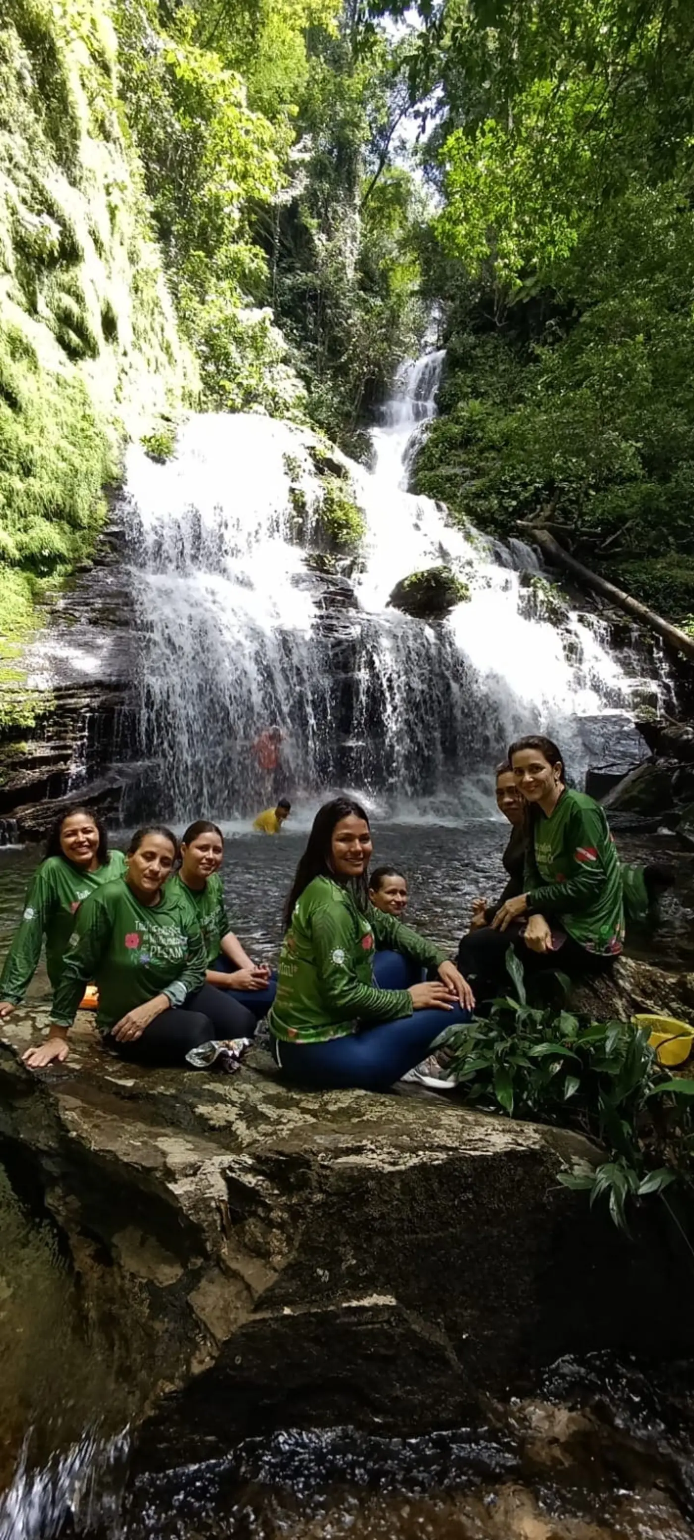 Por volta das 9h, o grupo partiu em direção ao Parque Estadual. Ao chegarem, as participantes fizeram o aquecimento, um cuidado que reflete a essência do evento: antes de cuidar de outros, é preciso cuidar de si. Com energia renovada, elas iniciaram a caminhada de aproximadamente 2,5 quilômetros pela trilha ecológica, rumo a dois dos atrativos do Pesam: a Cachoeira Vargem Grande e o Poção do Antônio Crente, cujas águas cristalinas e paisagem exuberante foram o cenário perfeito para a celebração.