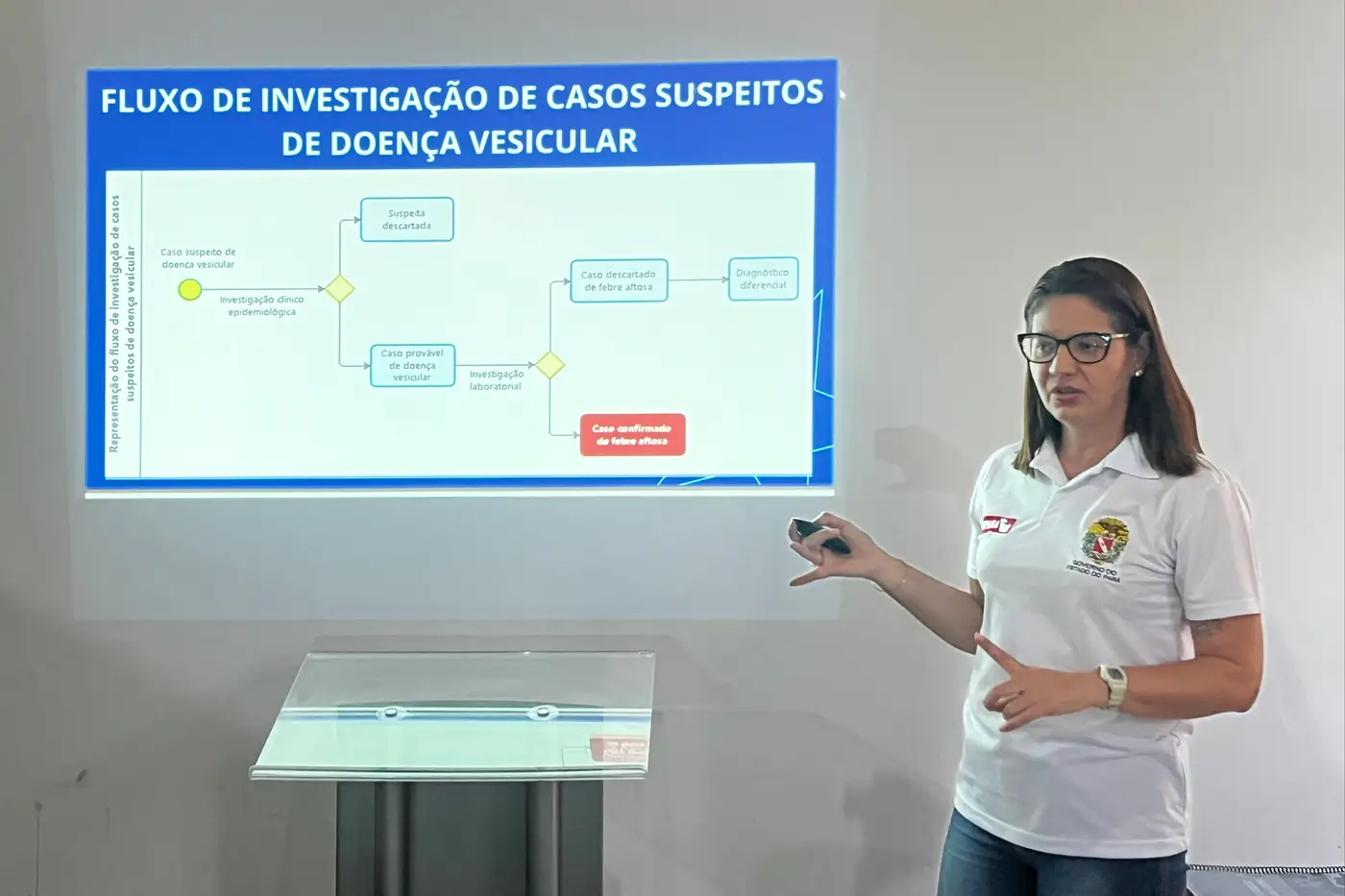No primeiro dia, a fiscal Glaucy Carreira abordou a vigilância para febre aftosa, destacando a importância da notificação imediata de suspeitas de doenças vesiculares, medida essencial para garantir a rápida atuação do serviço veterinário oficial na contenção de possíveis focos. A veterinária também reforçou a importância de executar os protocolos de biossegurança nas propriedades onde o serviço veterinário oficial realiza os atendimentos a notificação de suspeita de doença vesicular.