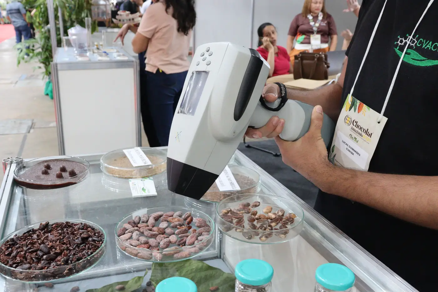 No estande, o público poderá conhecer também as ferramentas e análises realizadas pelo laboratório, incluindo avaliações físicas, físico-químicas e sensoriais. “Aqui a gente consegue mostrar para o público a roda de aromas, que simula o cheiro que as amêndoas podem adquirir a partir da forma de manejo. Além disso, a gente apresenta a amêndoa in natura, fermentada, triturada separando a casca e o nibs de cacau. Temos também a demonstração de alguns equipamentos que usamos para otimizar o processo de análises”, explica Carlos Silva, pesquisador do centro.