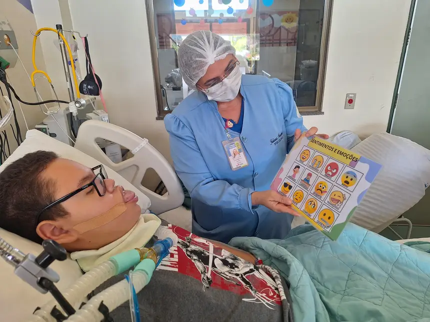 Paciente morador da unidade desde 2011, o adolescente Luan Gabriel Castro, de 15 anos, passou a utilizar o recurso há cerca de dois meses. Durante o atendimento, a psicóloga apresenta imagens em uma prancha e, a cada pergunta, o paciente responde piscando os olhos para indicar “sim” ou permanece imóvel para sinalizar “não”. Dessa forma, ele consegue comunicar emoções como felicidade, tristeza ou irritação, além de preferências, necessidades básicas e comportamentos.