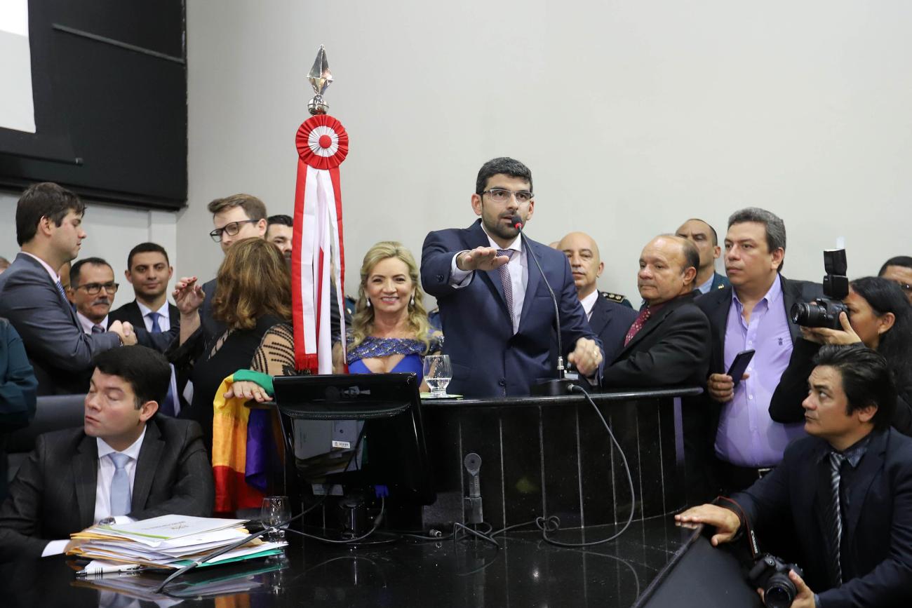 O governador Helder Barbalho prestigiou, na manhã desta sexta-feira (1°), a posse dos novos deputados estaduais do Pará, no plenário Newton Miranda, da Assembleia Legislativa do Estado (Alepa). Na ocasião, os parlamentares também elegeram a nova Mesa Diretora da Casa para um mandato de dois anos. O presidente será o deputado Daniel Barbosa Santos, mais conhecido como Dr. Daniel, sem partido no momento. A cerimônia foi conduzida pela deputada Cilene Couto, tendo como secretários os deputados Martinho Carmona e Miro Sanova. FOTO: MARCO SANTOS/AG. PARÁ DATA: 01.02.2019 BELÉM - PARÁ