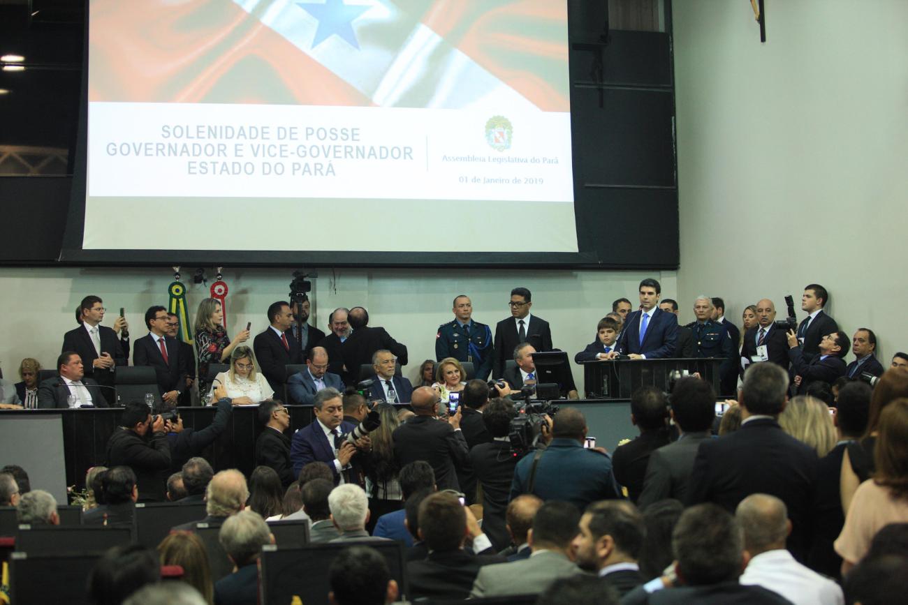Helder Barbalho tomou posse como governador do estado do Pará para o quadriênio 2019-2022, ao lado do vice, Lúcio Vale. A sessão solene ocorreu na manhã desta terça-feira (1°), em Belém, no plenário Newton Miranda, da Assembleia Legislativa do Pará (Alepa), e contou com a participação de deputados estaduais e federais, prefeitos, vereadores, secretários escolhidos para compor o novo governo, bem como demais autoridades locais e lideranças dos mais diversos setores. Compuseram a mesa solene, a presidente em exercício da Alepa, a deputada estadual Cilene Couto, o Desembargador do Tribunal de Justiça do Estado do Pará, José Maria Teixeira do Rosário, o senador da República Jader Barbalho, a deputada federal Elcione Barbalho, o vice-prefeito de Belém, Orlando Reis, a presidente do Tribunal de Contas do Estado do Pará, conselheira Lourdes Lima, e o quarto secretário da mesa diretora da Alepa, deputado Soldado Tércio.