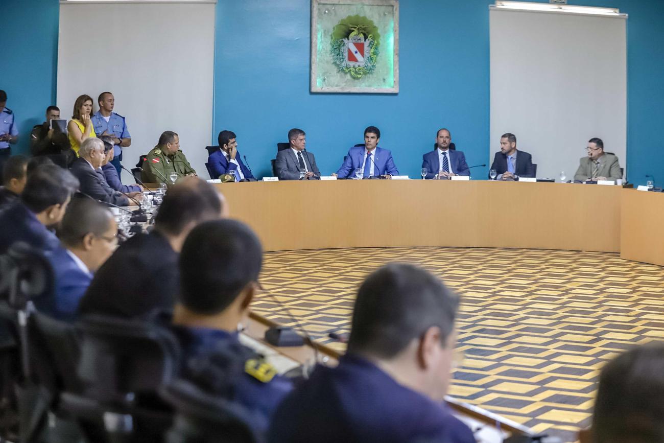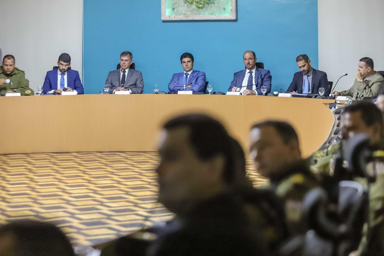 O general Guilherme Theophilo, titular da Secretaria Nacional de Segurança Pública (Senasp), desembarcou hoje ao Pará e apresentou ao governador Helder Barbalho e representantes dos órgãos do Sistema de Segurança Pública (SISP) o Programa Nacional de Enfrentamento à Criminalidade Violenta, que terá início nos próximos meses e, assim como ocorre no planejamento do governo do Pará, o programa federal também une o uso das forças policiais com ações de governo que efetivamente atuem no prevenção à criminalidade. A reunião teve ainda a participação de representantes dos poderes legislativos estadual e federal, e da Prefeitura de Ananindeua, um dos 7 municípios escolhidos pelo Governo Federal para receber o programa nacional. FOTO: MARCO SANTOS / AGÊNCIA PARÁ DATA: 07.03.2019 BELÉM - PA