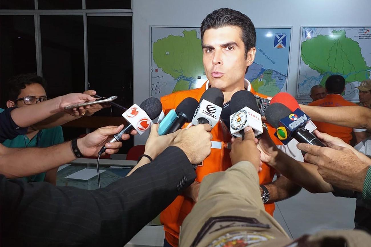 O inquérito aberto pela Polícia Civil (PC) para investigar o acidente na ponte Rio Moju aponta que a embarcação que colidiu com a estrutura não tinha licença para o transporte da carga. A informação foi confirmada pelo delegado geral da corporação, Alberto Teixeira, durante coletiva realizada na sede do Comando Geral do Corpo de Bombeiros na noite deste domingo (7). A reunião foi convocada pelo governador Helder Barbalho e pelo vice, Lúcio Vale, para discutir o andamento das diversas ações já iniciadas pela gestão estadual após o incidente, ocorrido por volta de 1h do último sábado (6). FOTO: FERNANDO ARAÚJO / AGÊNCIA PARÁ DATA: 08.04.2019 BELÉM - PA