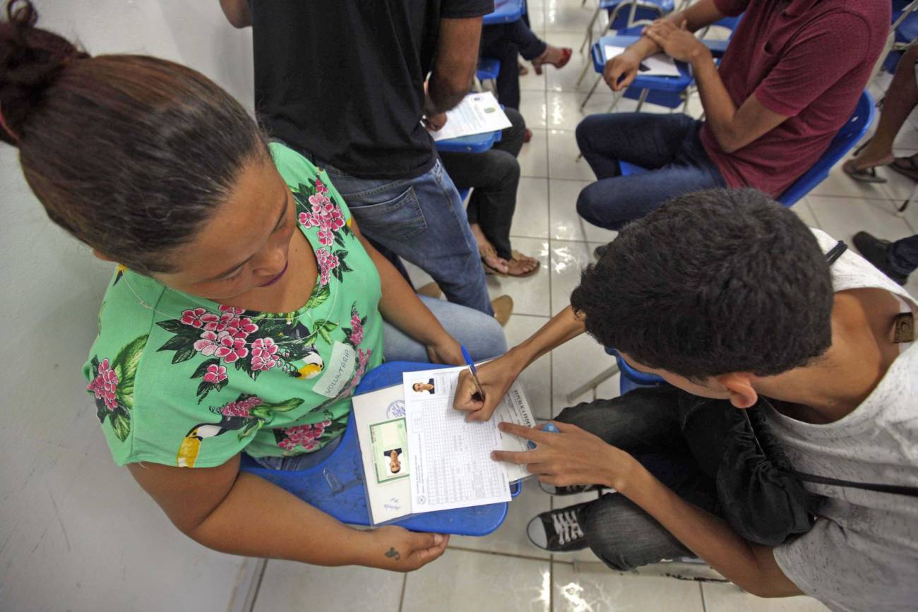 “Perdi todos os documentos na chuva, assim como quase tudo de dentro da casa. Poder tirar os documentos hoje, menos de uma semana depois do desastre e tudo de graça, é bom, chegou na hora certa e vai ajudar muita gente mesmo”. A fala é Adriano Pinheiro, morador do bairro Angelim, um dos 15 afetados pela forte enxurrada que alagou 40% do município de Paragominas, no nordeste paraense, na semana passada. Ele se soma a outras centenas de pessoas que estiveram nesta terça-feira (17), na Escola Municipal Anésia da Costa Chaves, primeiro local da Caravana do ProPaz no município. Semelhante as demais ações do ProPaz Cidadania, o programa está viabilizando no município a emissão de 2ª via de Certidão de Nascimento, Registro Geral (RG), 2ª via de CPF, carteira social (mudança de gênero), fotos para os documentos e a carteira do ID Jovem, que possibilita a jovens de 15 a 29 anos, diversos benefícios, entre eles, meia passagem em trajetos interestaduais. Na foto, volutários recebendo orientações. FOTO: SIDNEY OLIVEIRA / AG. PARÁ DATA: 17.04.2018 PARAGOMINAS - PARÁ
