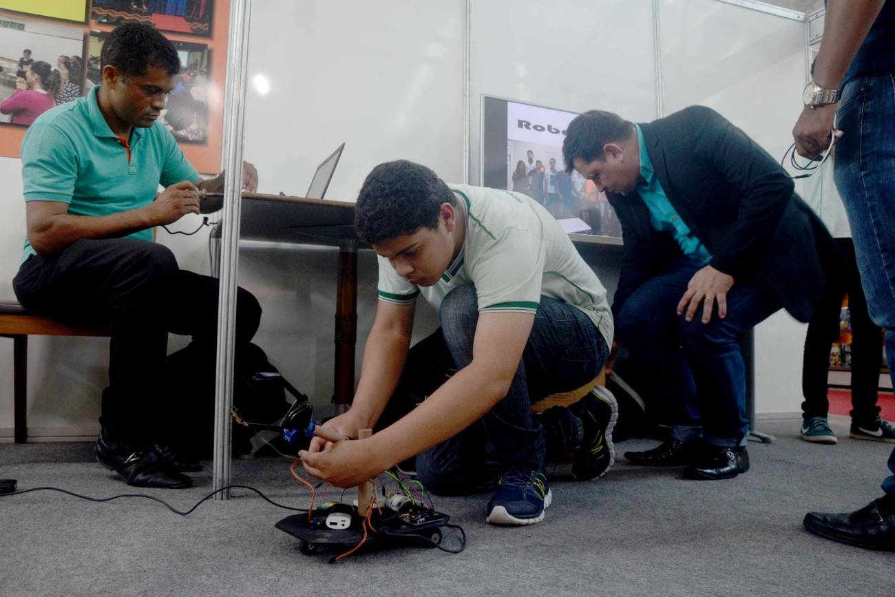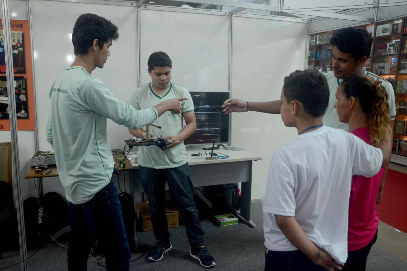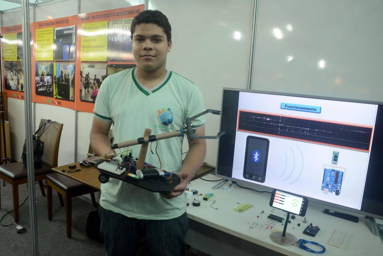 O projeto "Tecnologias sustentáveis: braço robótico" foi apresentado, nesta terça-feira (5), no estande da Secretaria de Estado de Educação (Seduc), na 22ª Feira Pan-Amazônica do Livro, no Hangar Convenções e Feiras da Amazônia com programação até o dia 10, com entrada franca. Criado em 2017 por estudantes do ensino técnico da Escola Estadual Dom Aristides Pirovano, o projeto busca incluir pessoas com deficiência utilizando materiais de baixo custo na fabricação do braço robótico. Membro da equipe desenvolvedora, o aluno Ayrton Sousa (foto), 17 anos, apresentava aos visitantes a sua criação. "Tivemos a ideia de fazer um projeto utilizando materiais recicláveis e sustentáveis. Levamos cerca de três meses para produzir este braço robótico e nosso objetivo é aprimorar ele cada vez mais", conta o estudante.