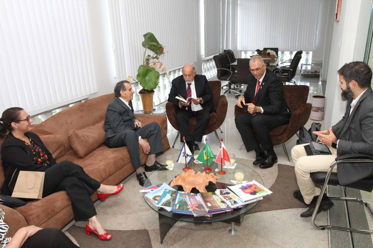 Segurança, tecnologia, educação e recursos hídricos foram alguns dos temas em pauta durante encontro entre o governador Simão Jatene (e) e o embaixador de Israel no Brasil, Yossi Shelley, na tarde desta quarta-feira (13), no Palácio do Governo, em Belém. A reunião também contou presença do presidente do Centro Israelita do Pará, Marcos Soares e dos representantes da comunidade israelita, Ana Bentes Bloch (d) e Elias Ramiro Bentes. Com a visita, o País do oriente médio busca estreitar as relações com o Estado e iniciar a construção de parcerias e cooperações em setores estratégicos como ciência, tecnologia e conhecimento. Entre os temas debatidos está a questão da segurança. Israel possui, por exemplo, uma grande expertise em tecnologias utilizadas na área. “Temos um grande conhecimento no que diz respeito à tecnologia para a segurança. Apresentamos algumas utilizadas em nosso País, como softwares de monitoramento, rastreamento, entre outros, que podem ser interessantes para o governo do Pará”, afirmou o embaixador Yossi Shelley. As possibilidades de contribuição também incluem intercâmbios e capacitação profissional na área. FOTO: CRISTINO MARTINS / AG. PARÁ DATA: 13.06.2018 BELÉM - PARÁ