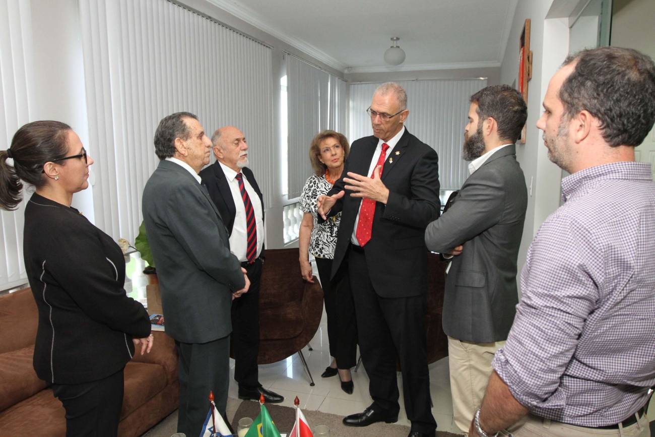Segurança, tecnologia, educação e recursos hídricos foram alguns dos temas em pauta durante encontro entre o governador Simão Jatene (2º da esq/dir) e o embaixador de Israel no Brasil, Yossi Shelley (4º da esq/dir), na tarde desta quarta-feira (13), no Palácio do Governo, em Belém. A reunião também contou presença do presidente do Centro Israelita do Pará, Marcos Soares e dos representantes da comunidade israelita, Ana Bentes Bloch (3º da esq/dir) e Elias Ramiro Bentes (1º da esq/dir). Com a visita, o País do oriente médio busca estreitar as relações com o Estado e iniciar a construção de parcerias e cooperações em setores estratégicos como ciência, tecnologia e conhecimento. Entre os temas debatidos está a questão da segurança. Israel possui, por exemplo, uma grande expertise em tecnologias utilizadas na área. “Temos um grande conhecimento no que diz respeito à tecnologia para a segurança. Apresentamos algumas utilizadas em nosso País, como softwares de monitoramento, rastreamento, entre outros, que podem ser interessantes para o governo do Pará”, afirmou o embaixador Yossi Shelley. As possibilidades de contribuição também incluem intercâmbios e capacitação profissional na área.