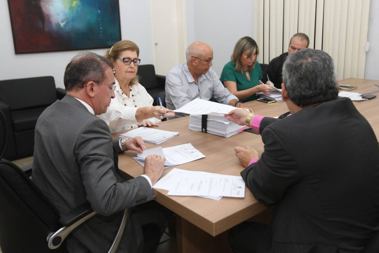 A comissão do governo atual, comandada pelo Procurador-Geral do Estado, Ophir Cavalcante Júnior (c), e pelo Auditor-Geral do Estado, Roberto Amoras (e), se reuniu nesta terça-feira (27), com os membros da comissão do governo eleito, Maria Eugenia Rio (d), Eduardo Ribeiro (d), Hana Sampaio Ghassan e Fabrício de Paula.