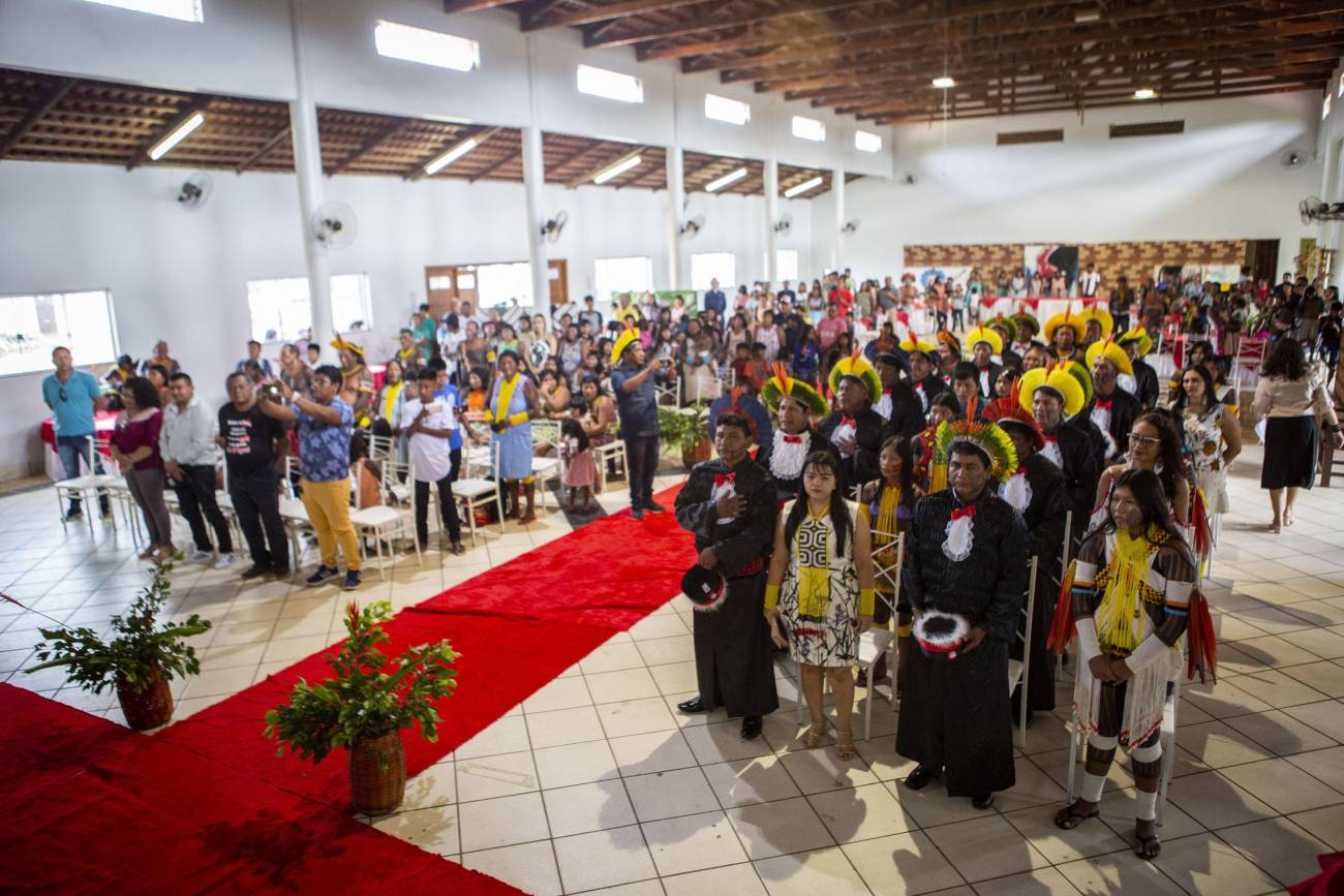 Cerimônia de outorga de grau aos 15 indígenas integrantes da primeira turma do povo Kayapo do curso de licenciatura intercultural indígena da Uepa, na manhã desta quinta-feira, 06, em São Félix do Xingu.
