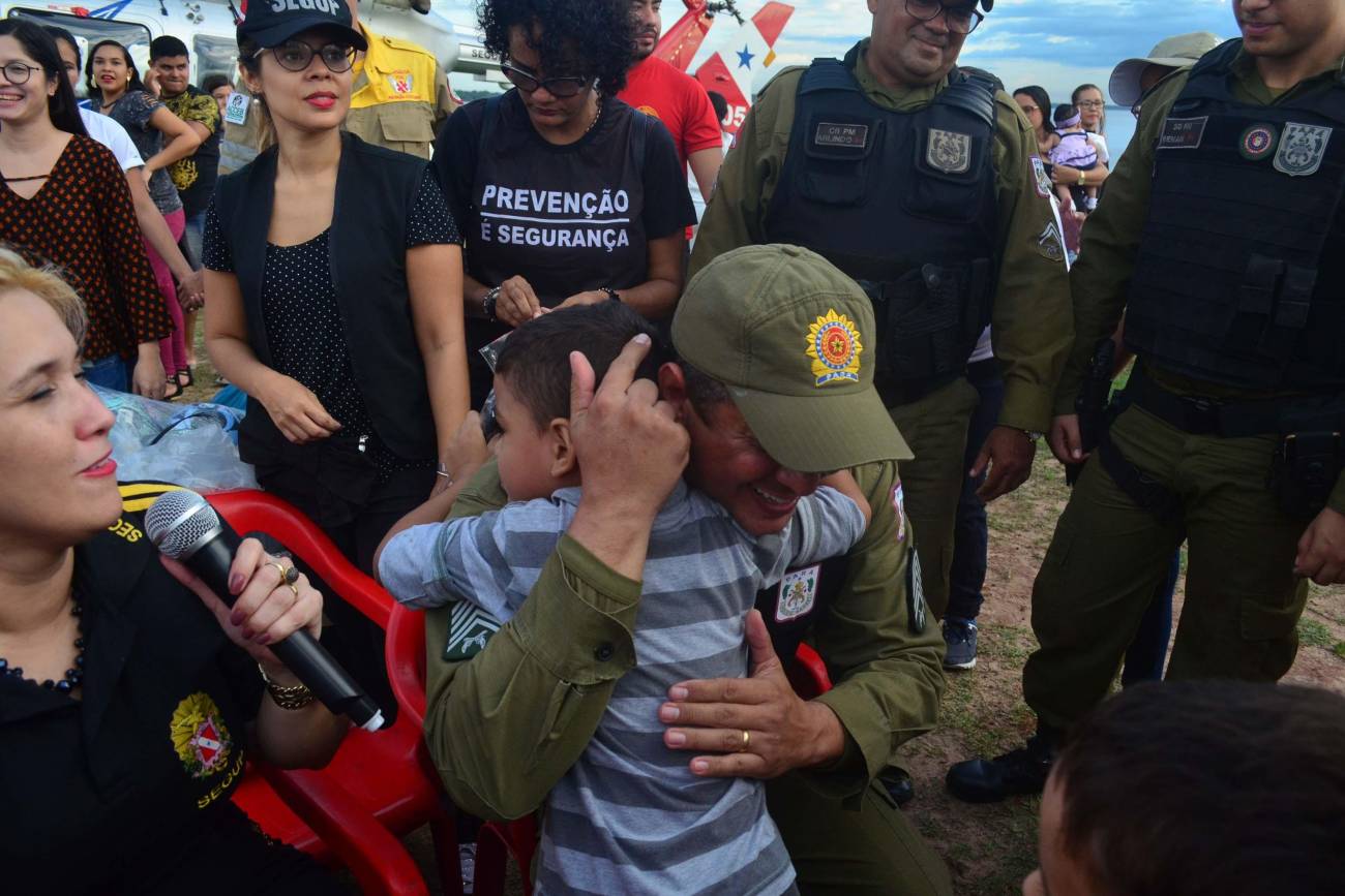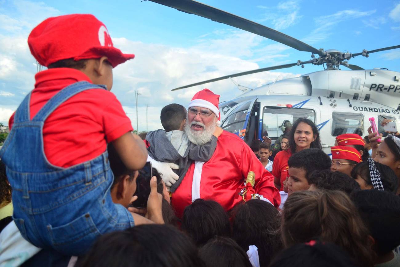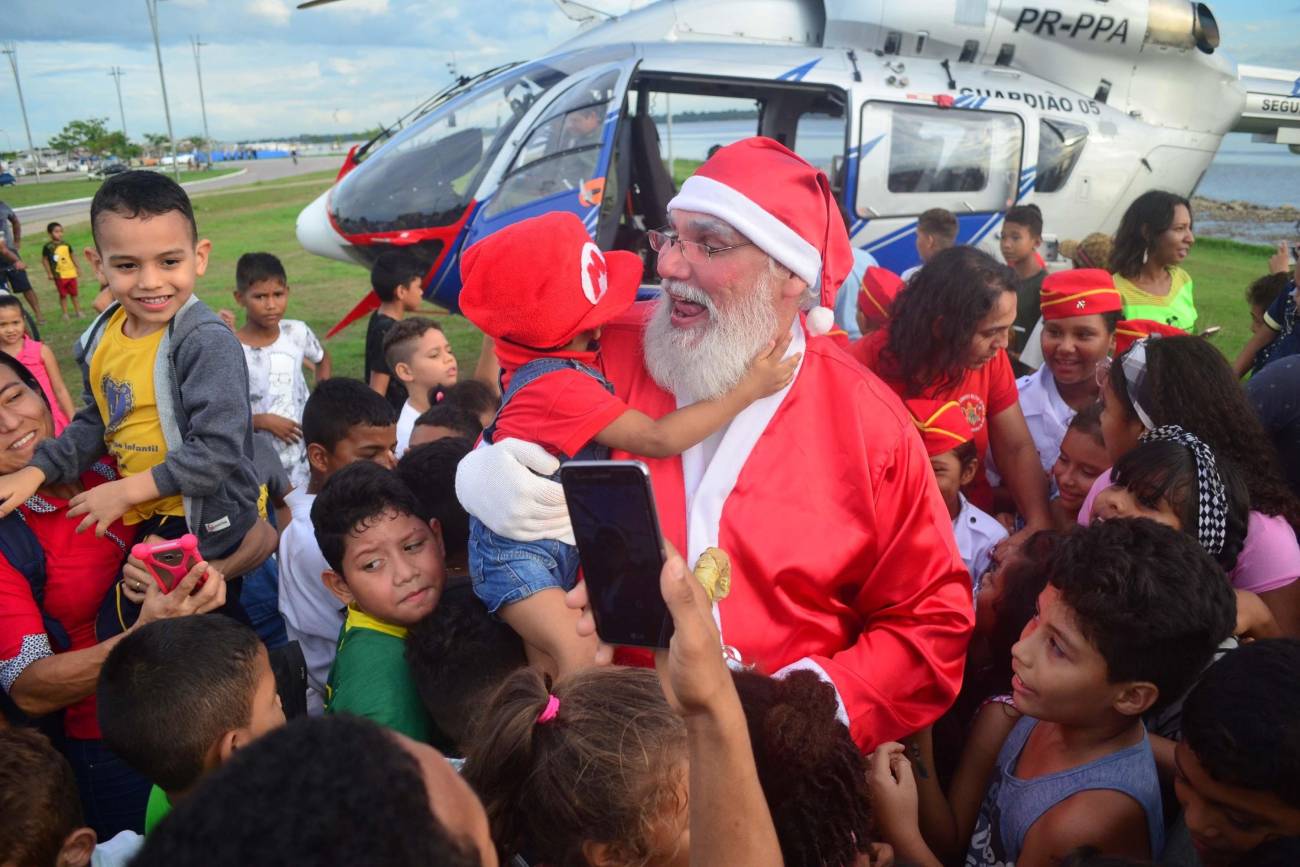Uma tarde para não sair da memória de centenas de crianças que participaram na tarde desta sexta-feira, 7, do Natal com Segurança (foto) promovido pela Secretaria de Estado de Segurança Pública e Defesa Social (Segup). Com olhos atentos para o céu, meninos e meninas receberam com emoção o delegado de polícia que se tornou Papai Noel por um dia. Ele chegou ao Portal da Amazônia em um helicóptero do Grupamento Aéreo de Segurança Pública (Graesp) causando emoção aos presentes.