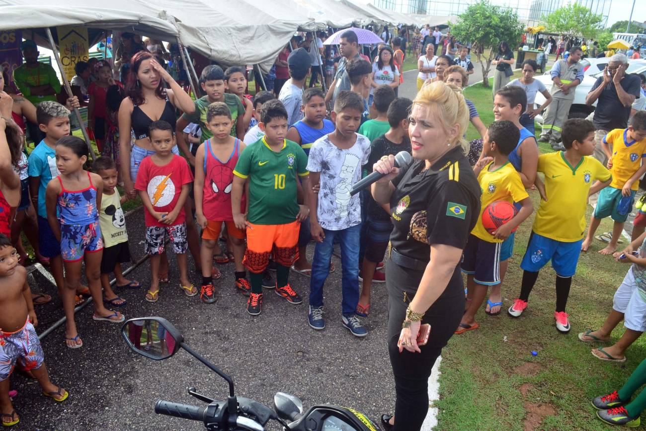 Uma tarde para não sair da memória de centenas de crianças que participaram na tarde desta sexta-feira, 7, do Natal com Segurança promovido pela Secretaria de Estado de Segurança Pública e Defesa Social (Segup). Com olhos atentos para o céu, meninos e meninas receberam com emoção o delegado de polícia que se tornou Papai Noel por um dia. Ele chegou ao Portal da Amazônia em um helicóptero do Grupamento Aéreo de Segurança Pública (Graesp) causando emoção aos presentes. Na foto, a diretora de Prevenção da Segup, Sílvia Rego.