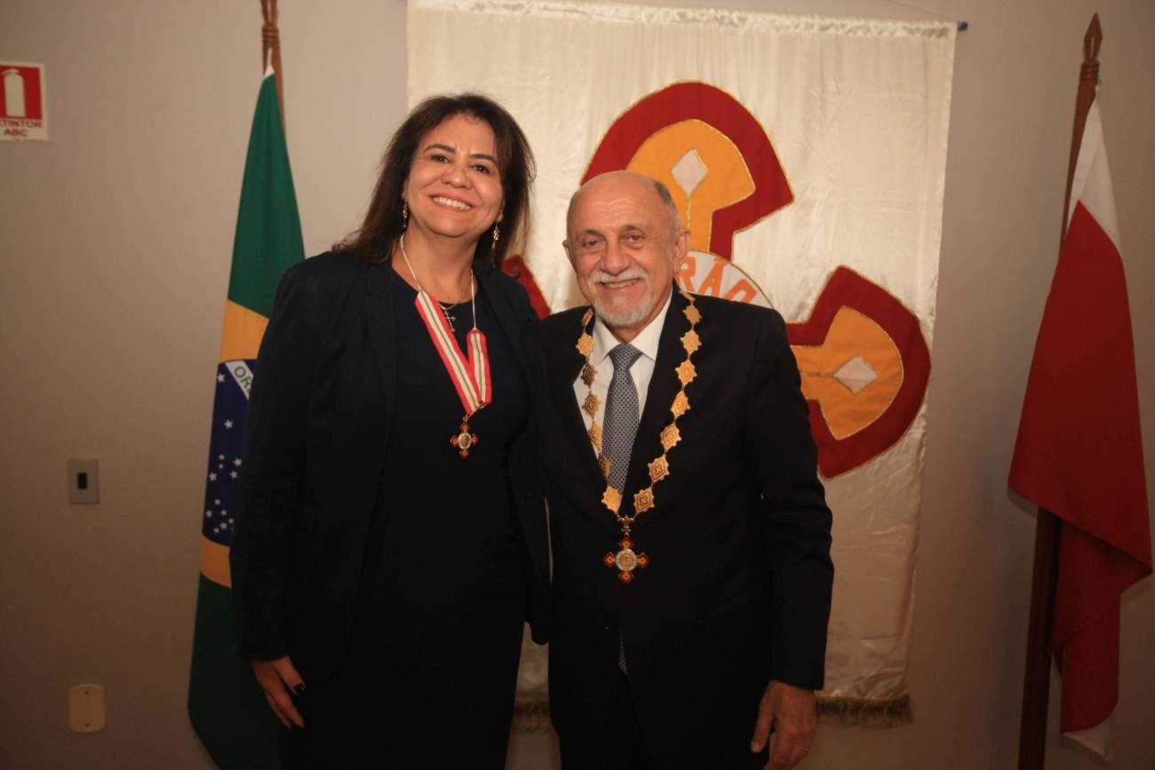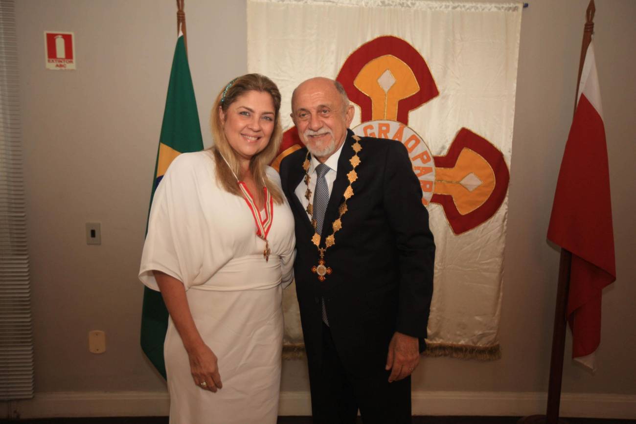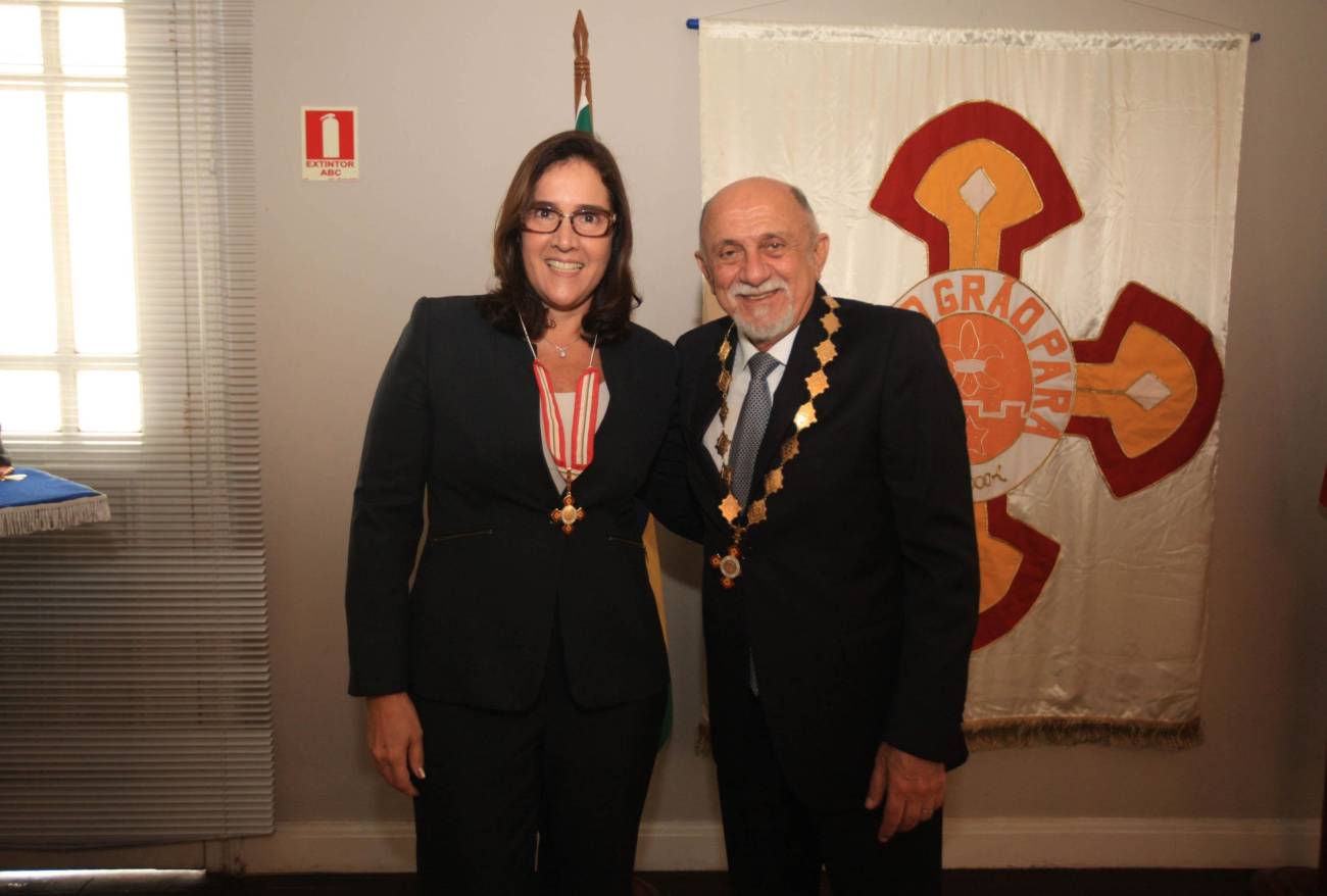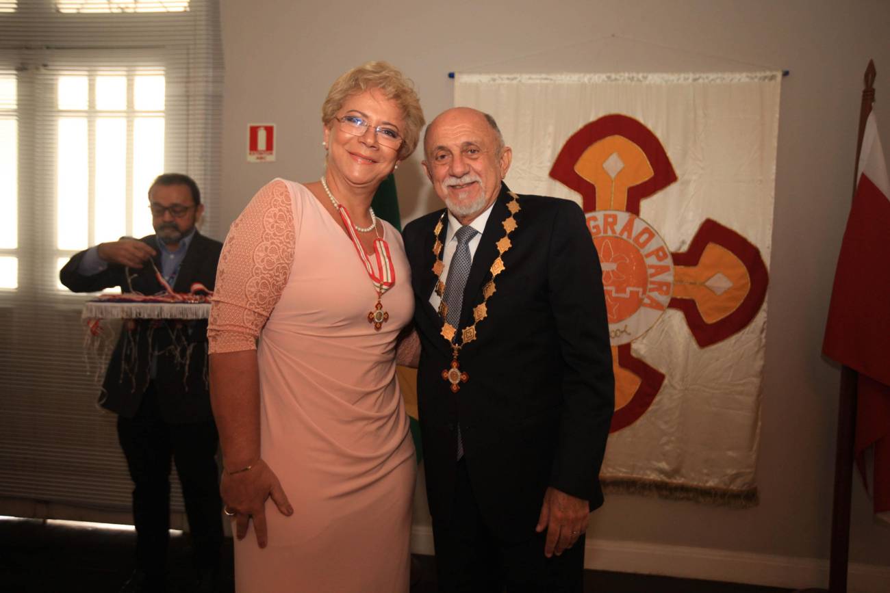 O Governo do Estado do Pará concedeu hoje 230 comendas do Mérito Grão-Pará, a mais alta do Estado, a autoridades e servidores que se destacaram nos últimos oito anos de serviços prestados à população. “O ciclo que encerramos hoje não encerra nossa missão de servir ao público, porque uma vez servidores públicos, trabalhando em benefício da população, nunca mais deixamos de sê-lo, pois essa missão fica gravada em nossos corações”, disse o governador Simão Jatene aos agraciados. O governador entregou, pessoalmente, uma a uma as condecorações. Das 230 medalhas, 14 foram no grau de Grande Oficial, 60 no grau de Comendador, 8 no grau de Oficial e 11 no grau de Cavaleiro aos servidores civis. Entre os militares, 4 receberam no grau de Comendador, 38 de Oficial e 109 no grau de Cavaleiro. Na foto, a presidente do Tribunal Regional Eleitoral, desembargadora Célia Regina Pinheiro e o governador Simão Jatene.