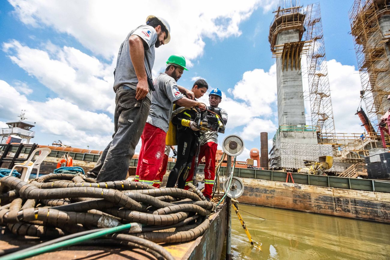 Mergulhadores retiram do fundo do rio partes dos escombros da ponte rio Moju