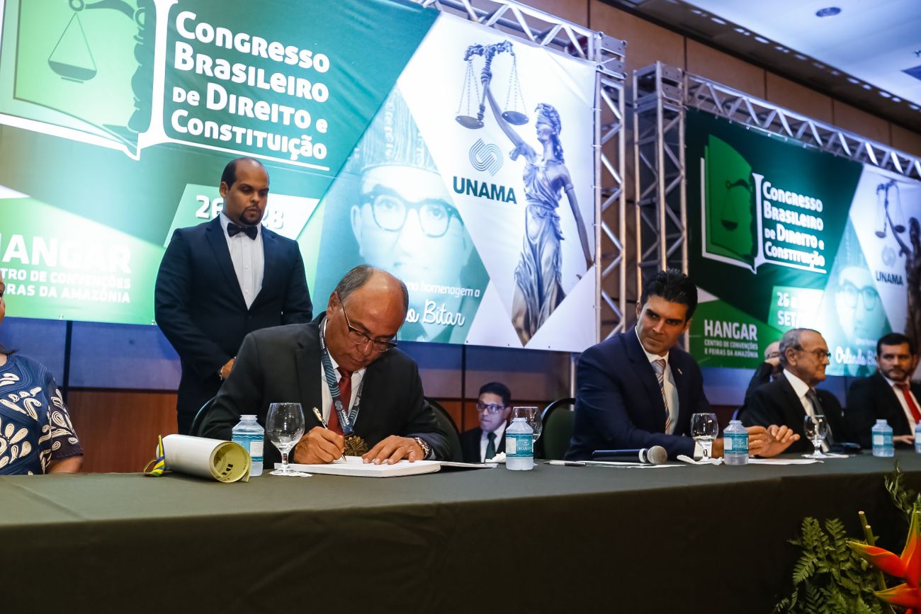 O governador Helder Barbalho foi agraciado com a comenda "Tobias Barreto" na noite desta quinta-feira (26), durante a abertura do I Congresso Brasileiro de Direito e Constituição, que ocorre no Hangar - Convenções e Feiras da Amazônia até sábado o próximo sábado (28). A honraria concedida pelo Instituto Brasileiro de Estudos do Direito (Ibed) reconhece o trabalho, o sólido conhecimento e os serviços prestados ao Direito e à Justiça. <div class='credito_fotos'>Foto: Marcelo Seabra / Ag. Pará   |   <a href='/midias/2019/originais/5501_20190926201649__mg_8054.jpg' download><i class='fa-solid fa-download'></i> Download</a></div>