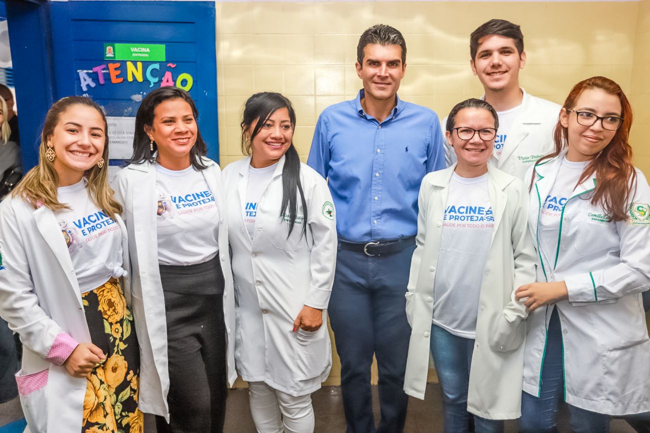 O governador do Pará, Helder Barbalho, e o secretário estadual de Saúde do Pará, Alberto Beltrame, lançaram oficialmente, nesta sexta-feira (27), em Belém, a Campanha Vacinação contra o Sarampo, que foi antecipada especialmente no Estado para resgatar a cobertura vacinal contra a doença e assim aumentar a proteção da população paraense. <div class='credito_fotos'>Foto: Marco Santos / Ag. Pará   |   <a href='/midias/2019/originais/5502_antecipacaodevacinacontraosarampo-fotomarcosantos-26.jpg' download><i class='fa-solid fa-download'></i> Download</a></div>