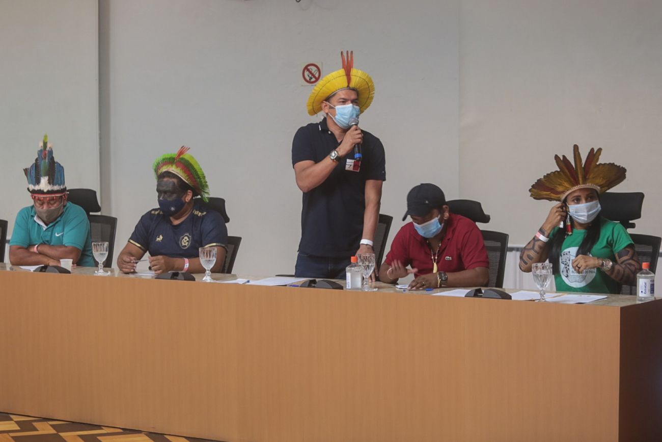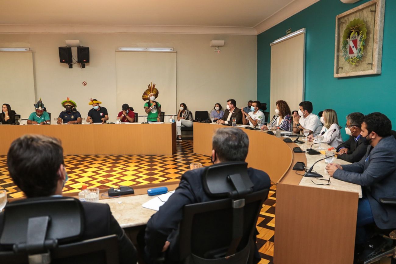 Nesta quarta-feira (23), o Governo do Estado criou um grupo de trabalho que será responsável pela execução das pautas indígenas no Pará. A decisão do Governador Helder Barbalho foi depois de um encontro com lideranças indígenas de diversas etnias, que trouxeram à gestão estadual 11 reivindicações, que foram apresentadas durante a 2ª Reunião Ordinária do Conselho de Política Indigenista do Estado do Pará (Consepi), realizada na semana passada em Santarém, oeste paraense. <div class='credito_fotos'>Foto: Bruno Cecim / Ag.Pará   |   <a href='/midias/2021/originais/8747_28679ed7-ad99-cfba-91a7-88d4b82a3548.jpg' download><i class='fa-solid fa-download'></i> Download</a></div>