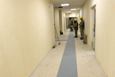 Obras de acabamento são realizadas no pavimento térreoNeste sábado (23), o titular da secretaria, Ruy Cabral, visitou o hospital para vistoriar a execução. Serviços de acabamento, como pintura e finalização de instalações estão ocorrendo no pavimento térreo. “Aumentamos o efetivo e ampliamos as jornadas de trabalho. Esta etapa é extremamente importante para garantir a funcionalidade do espaço. O objetivo é concluir os trabalhos em parte do pavimento térreo até o dia 2 de junho. Esta ação vai dar sustentação aos três pavimentos que serão ocupados pelos leitos”, explicou Ruy.