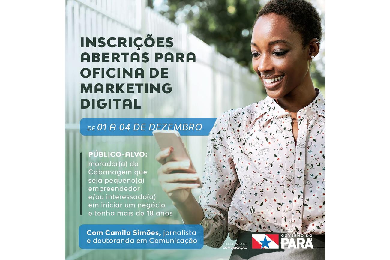 Serviço: Oficina de Marketing Digital no bairro da Cabanagem, em Belém. Período: de 1º a 4 de dezembro (terça a sexta-feira), das 8h30 às 12h30, na Escola Estadual José Valente Ribeiro. As inscrições são gratuitas e podem ser feitas on-line em https://docs.google.com/forms/d/e/1FAIpQLSeMqJDrvo2samTuURP7YcYze29ix9hGcrUIQuymo1xaxhtotg/viewform