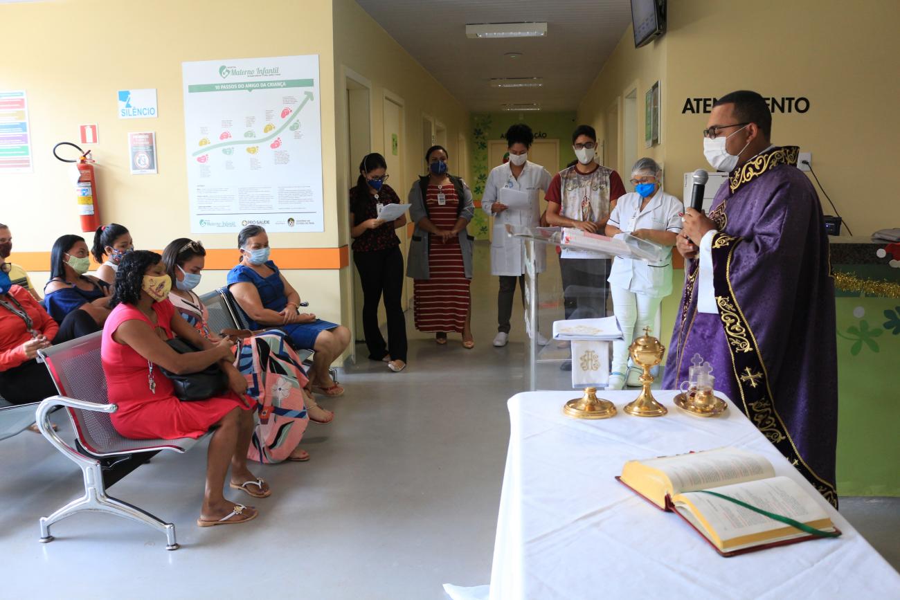 Com missa, apresentação de coral e homenagem da Orquestra Camerata, pacientes, acompanhantes e funcionários tiveram um dia especial no Hospital Materno-Infantil de Barcarena Dra. Anna Turan nesta quarta-feira (23). Pela manhã, o padre Idaltino dos Prazeres, da Paróquia São Francisco Xavier, celebrou missa na recepção da unidade. O ato religioso teve apresentação musical, leitura da história do nascimento de Jesus, reflexões sobre o significado do Natal e bênçãos aos pacientes e profissionais de saúde. As ações foram realizadas pelo Grupo de Humanização, em parceria com a Pastoral da Saúde e equipe assistencial do HMIB.
