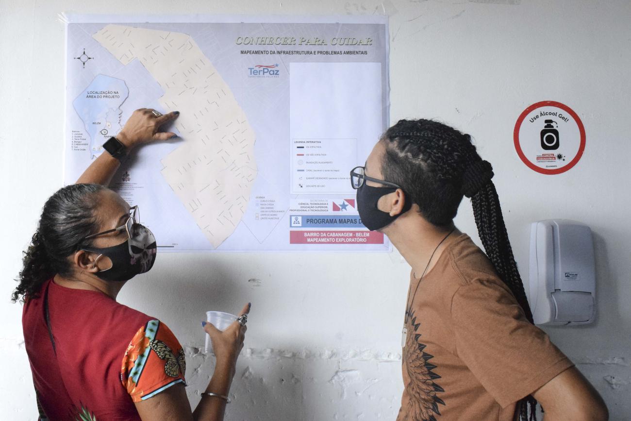 Reunião entre as equipes dos Mapas Digitais, Meu Endereço e lideranças comunitárias ocorreu na escola Dom Calábria, em Marituba“Desde o lançamento do Projeto no final de 2019, no bairro da Cabanagem, toda equipe elabora mapas digitais nos sete territórios beneficiados pelo TerPaz. Fazemos identificação e a localização das redes de escolas públicas e privadas; ruas sem pavimentação; praças e terrenos com potencial para implantação de projetos sociais e ambientais; quintais urbanos com potencial para a prestação de serviços ambientais; centros culturais e comunitários; hospitais e postos de saúde. Uma leitura urbana do território, que será construída com a participação da comunidade, pois ela é conhecedora da realidade local”, detalha o coordenador.