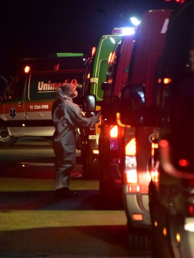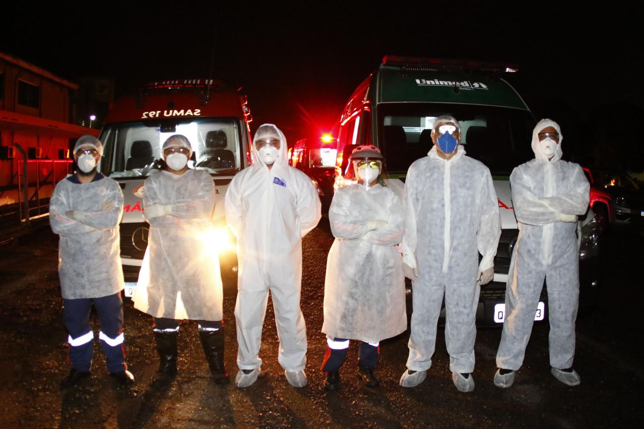 Várias ambulâncias, dos serviços público e privado de saúde, ajudaram no transporte dos pacientes Desinfecção - Assim que os pacientes foram retirados da aeronave, a equipe de Resposta Nuclear, Biológica, Química e Radiológica do Comando do 4º Distrito Naval realizou a descontaminação do espaço, procedimento considerado padrão nesses casos.