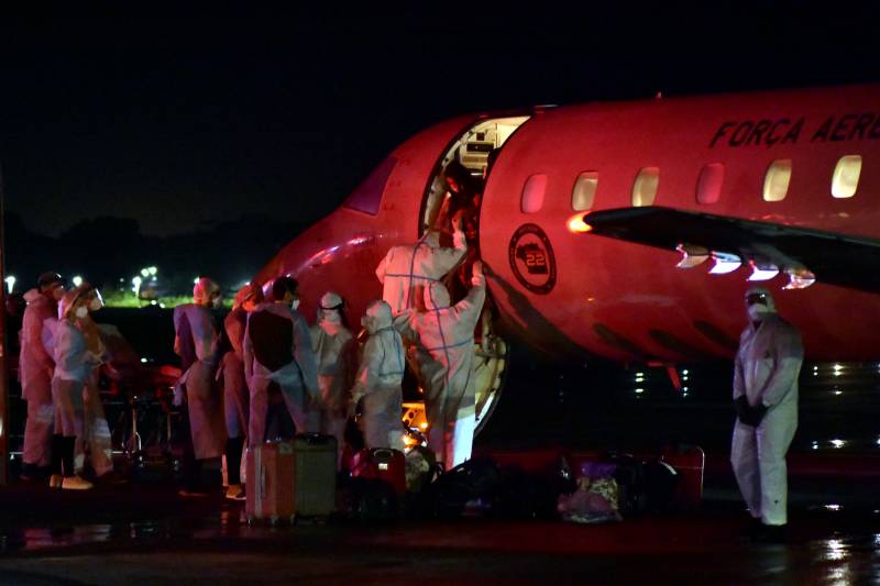 Três mulheres e 12 homens chegaram em avião da FAB, oriundos das cidades de Tefé e Manaus, e foram levados para o Hospital de Campanha, no Hangar