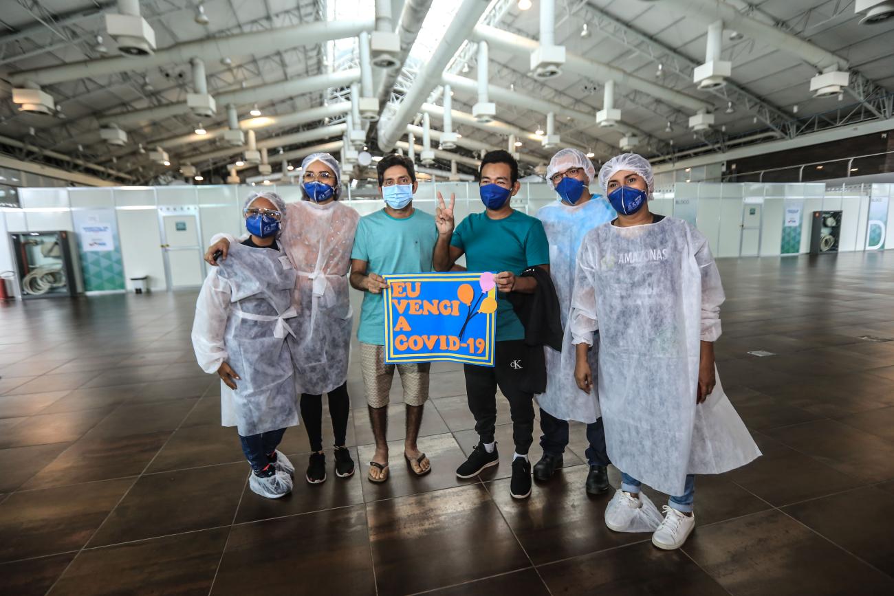 Pacientes que deixaram o Hospital de Campanha ao lado de profissionais que os ajudaram a vencer a doença