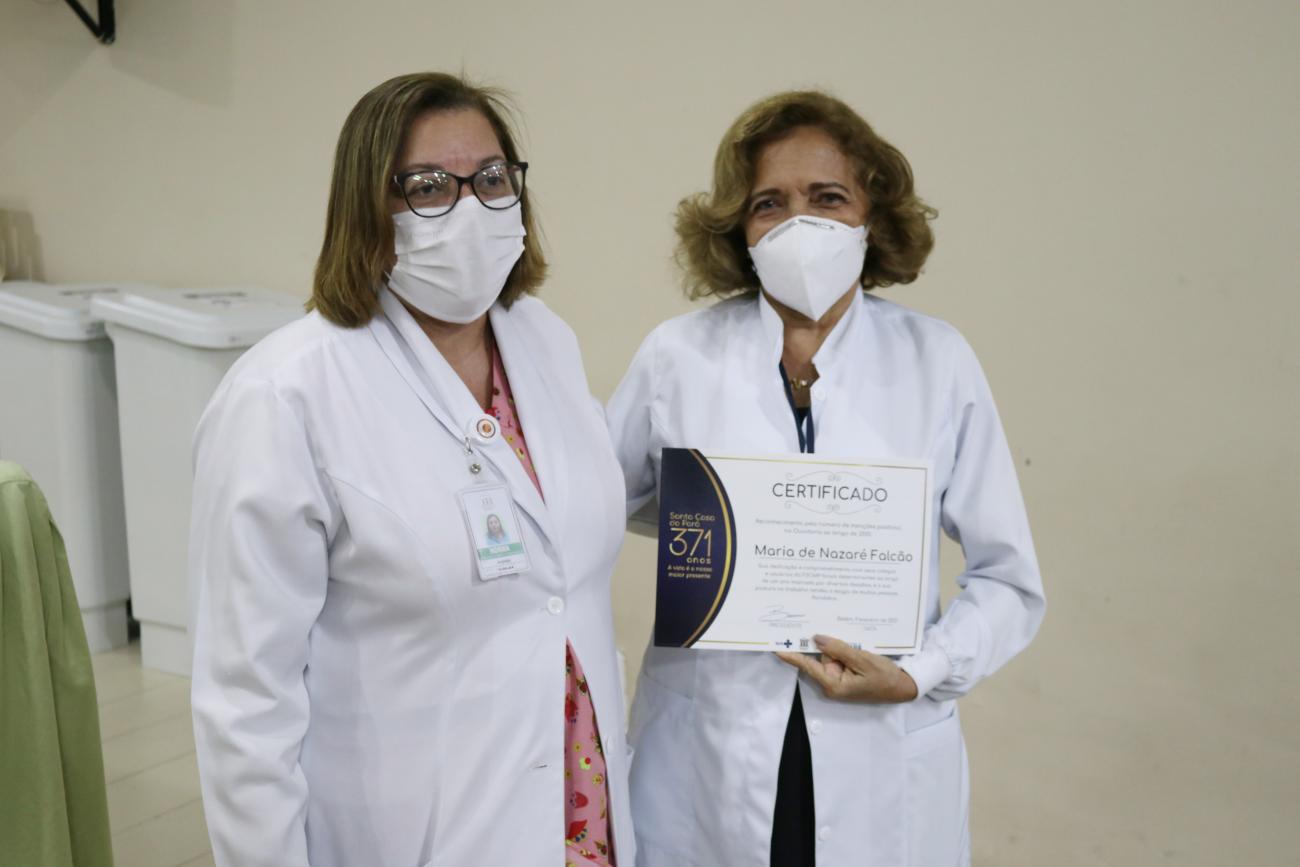 A enfermeira Nazaré Falcão (à esquerda), escolhida por usuários pelos bons serviços prestados, recebeu homenagem da OuvidoriaBruno Carmona observou que o tempo de existência da Santa Casa quase se confunde com o tempo da fundação de Belém. “É importante reconhecer o trabalho dessa instituição para a sociedade nesses quase quatro séculos de existência, atendendo os paraenses e pacientes de outros locais fora do estado”, afirmou.