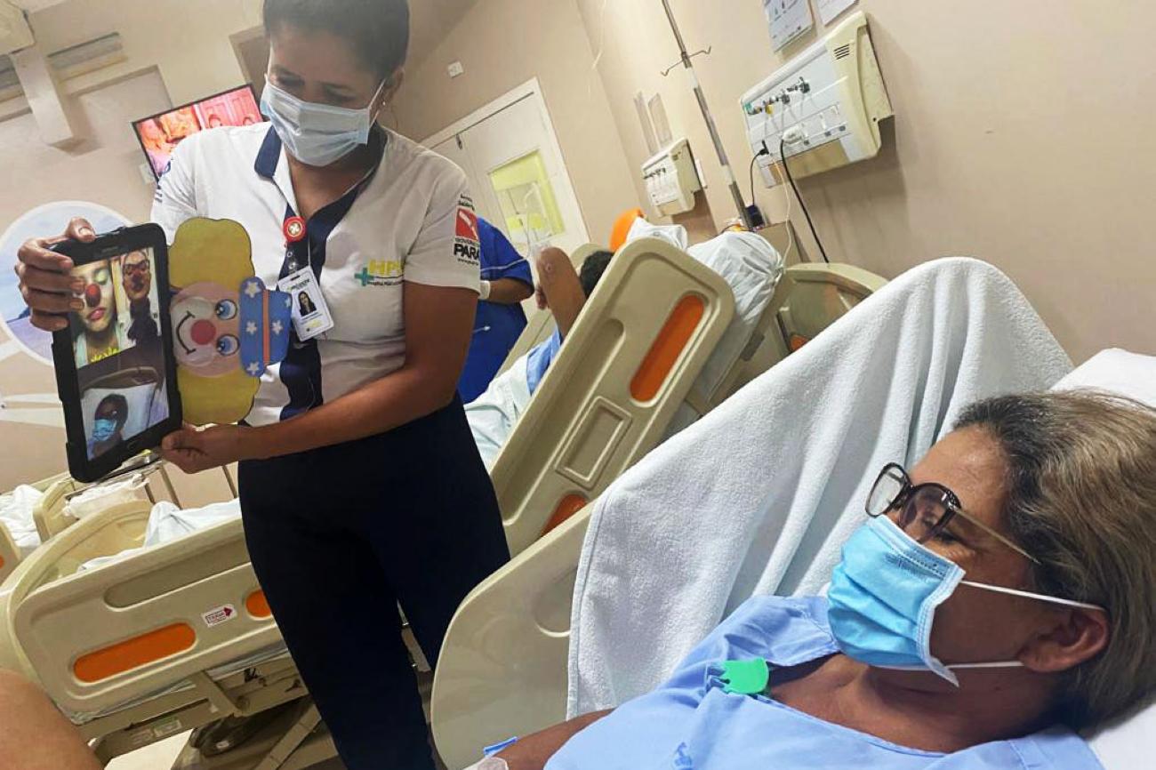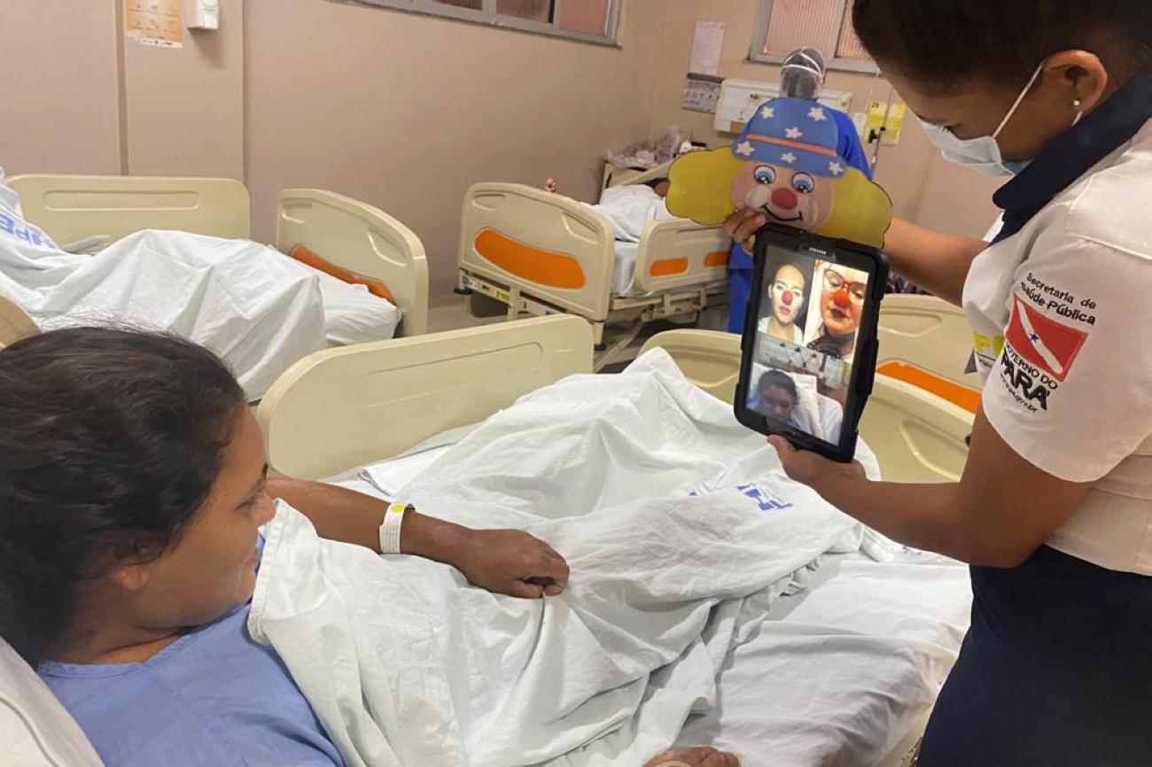 Pacientes do Hospital Público Estadual Galileu (HPEG), em Belém, agora contam com mais uma iniciativa humanizada de atendimento: a palhaçoterapia virtual. Usando um nariz vermelho e maquiagens características, palhaços voluntários estão realizando chamadas de vídeos com pacientes internados, proporcionando um momento de distração e alegria.