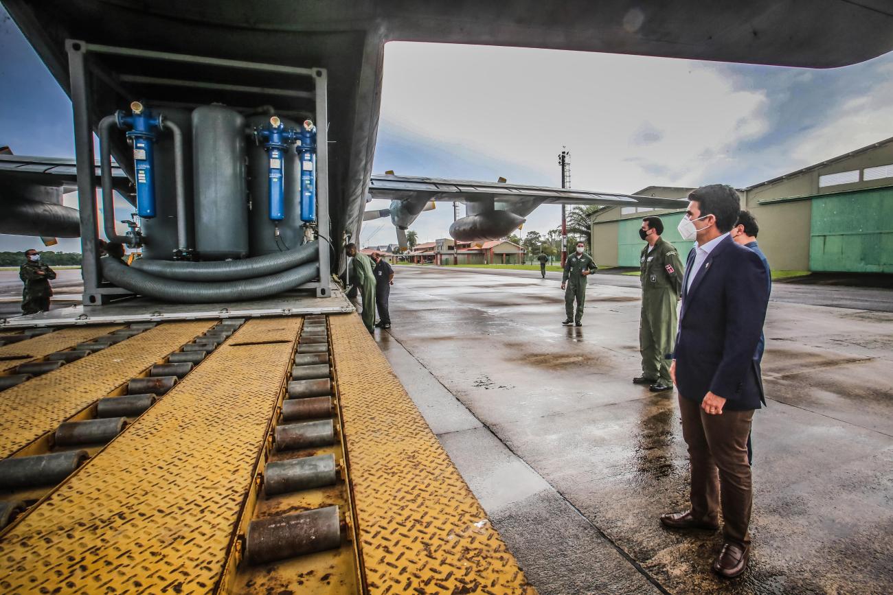 O governador agradeceu à Força Aérea Brasileira pelo transporte da usina de Manaus (AM) para Belém, e garantiu que o Pará continua trabalhando para vencer a pandemia. “Quero agradecer à Força Aérea Brasileira pelo traslado dessa usina, e reafirmar que vamos continuar trabalhando, todos juntos, para garantir atendimento à população, vacinar nossa gente, cuidar da economia e vencer com união essa pandemia”, reforçou Helder Barbalho.A usina foi transportada de Manaus para Belém em avião da FAB