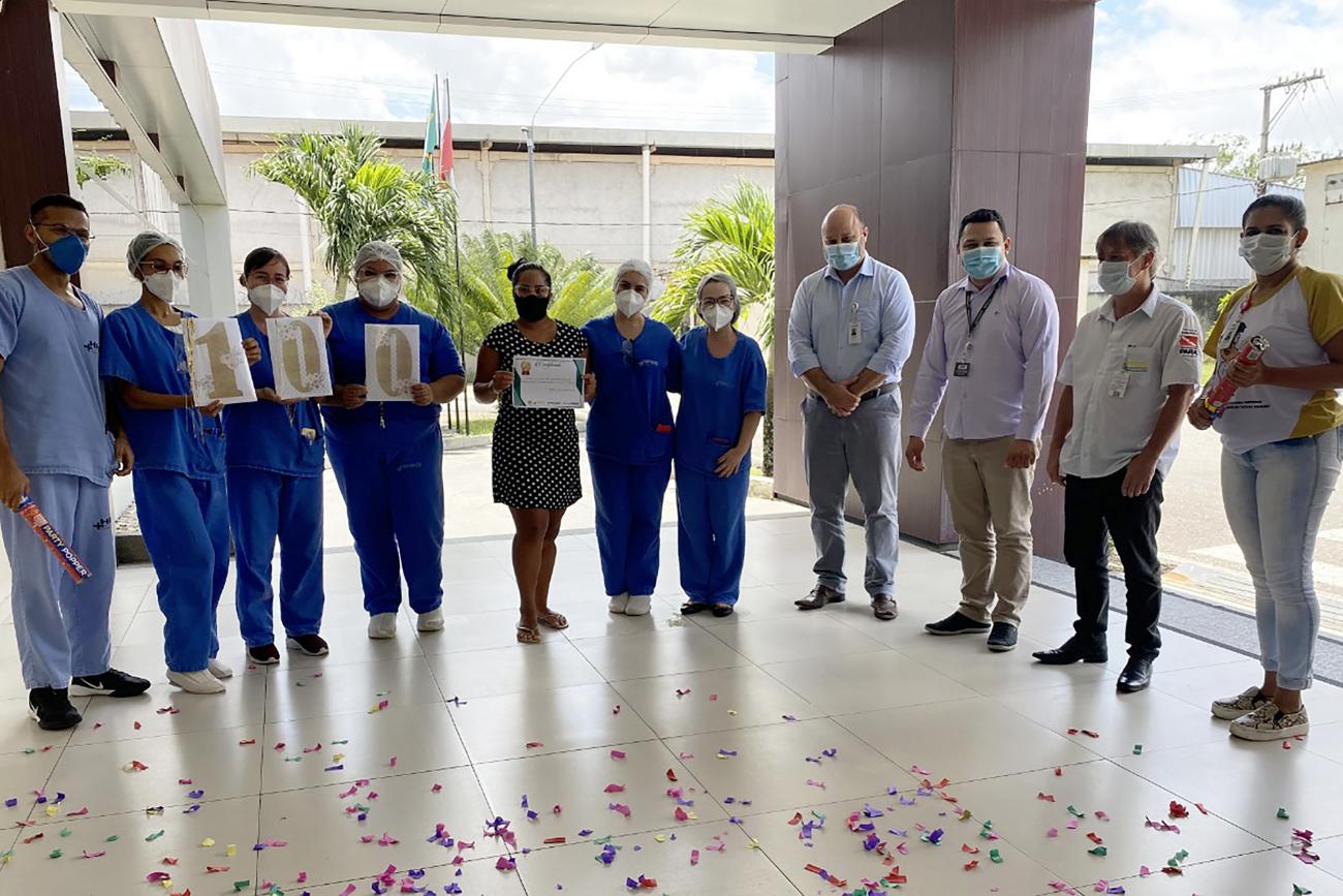 Equipe do Hospital Público Estadual Galileu, em Belém, ao lado da paciente Rosane Dias, recuperada após a internação por Covid-19Menos de um mês depois de retomar o atendimento de casos de Covid-19, o Hospital Público Estadual Galileu (HPEG), em Belém, já contabiliza quase 140 altas médicas. São 50 leitos de enfermaria e 10 de terapia intensiva dedicados exclusivamente a pacientes com a doença, transferidos de outras unidades por meio da Central de Regulação da Secretaria de Estado de Saúde Pública (Sespa).