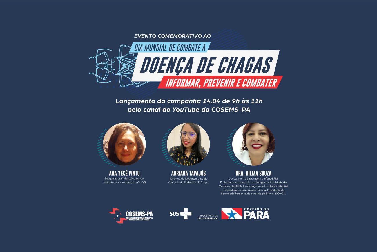 O evento sobre o Dia Mundial de Combate à Doença de Chagas: Informar, Prevenir e Combater será realizado nesta quarta-feira (14), às 9h, pelo canal do Youtube do Cosems-PA. Vai contar com a participação de Ana Yecê Pinto, pesquisadora/infectologista do Instituto Evandro Chagas; Adriana Tapajós, diretora do Departamento de Controle de Endemias da Sespa; e da médica cardiologista, Dra. Dilma Souza.