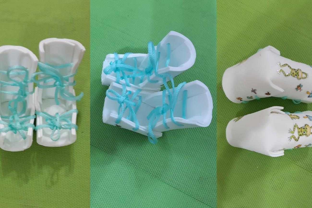 Órtese posicional confeccionada em EVA (Etileno de Acetato de Vinila)A fisioterapeuta da Fundação Santa Casa, Aurenir Araújo, relata que as órteses são confeccionadas com o que a instituição tem e explicou que o objetivo desse trabalho é dar todo o suporte para que as mães façam o tratamento em casa, pois a maioria dessas mulheres não têm condições de ir e vir com frequência até a Santa Casa, já que residem no interior do Estado.