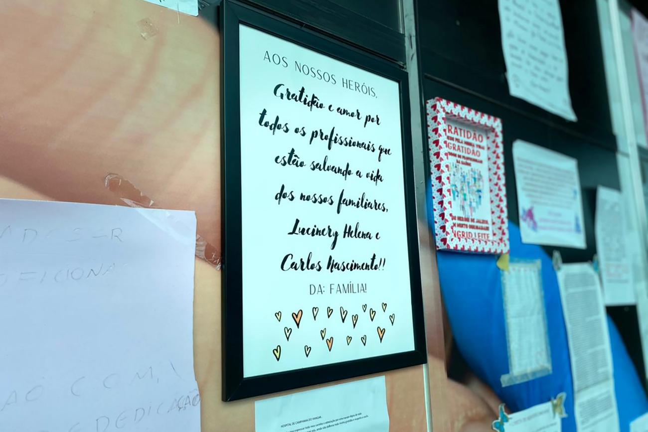 Essas são algumas das mensagens de agradecimentos externadas em cartazes colados na parede da entrada principal do Hospital de Campanha, onde os boletins diários são esperados pelos familiares.