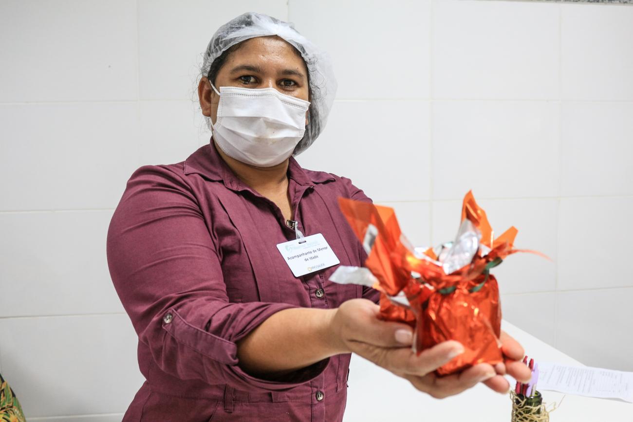 Após capacitação com a nutricionista da unidade, as participantes aprenderam técnicas de manipulação de chocolate com a terapeuta ocupacional Heloisa Santos. Com a prática, elas fizeram ovos de chocolate e aprenderam a produzir bombons, trufas e outros doces. “A oficina oportuniza um momento de lazer dentro da rotina hospitalar, e também abre caminho para que, futuramente, a prática possa se tornar uma ocupação laboral, trazendo segurança financeira para essas mães por meio da produção de doces”, disse a terapeuta.