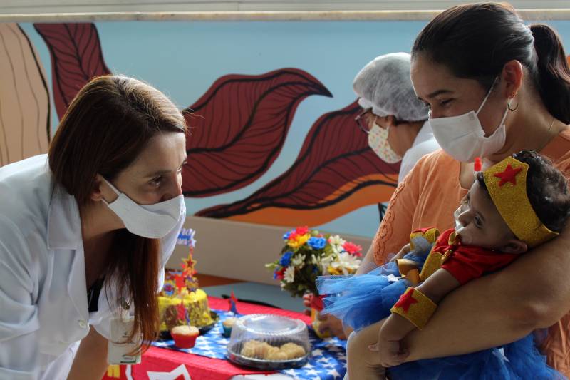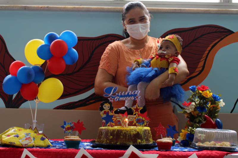 Lanise Nunes e Luna Vitória nas comemorações dos seis meses da paciente da Cardiologia do HCDesde os primeiros dias após seu nascimento, Luna Vitória é motivo de celebração diária. Natural do município de Capitão Poço, no Nordeste do Pará, a menina nasceu com uma cardiopatia congênita complexa. Nesta quinta-feira (22), quando completou seis meses de vida, Luna ganhou comemoração no Hospital de Clínicas Gaspar Vianna, em Belém, onde faz tratamento.