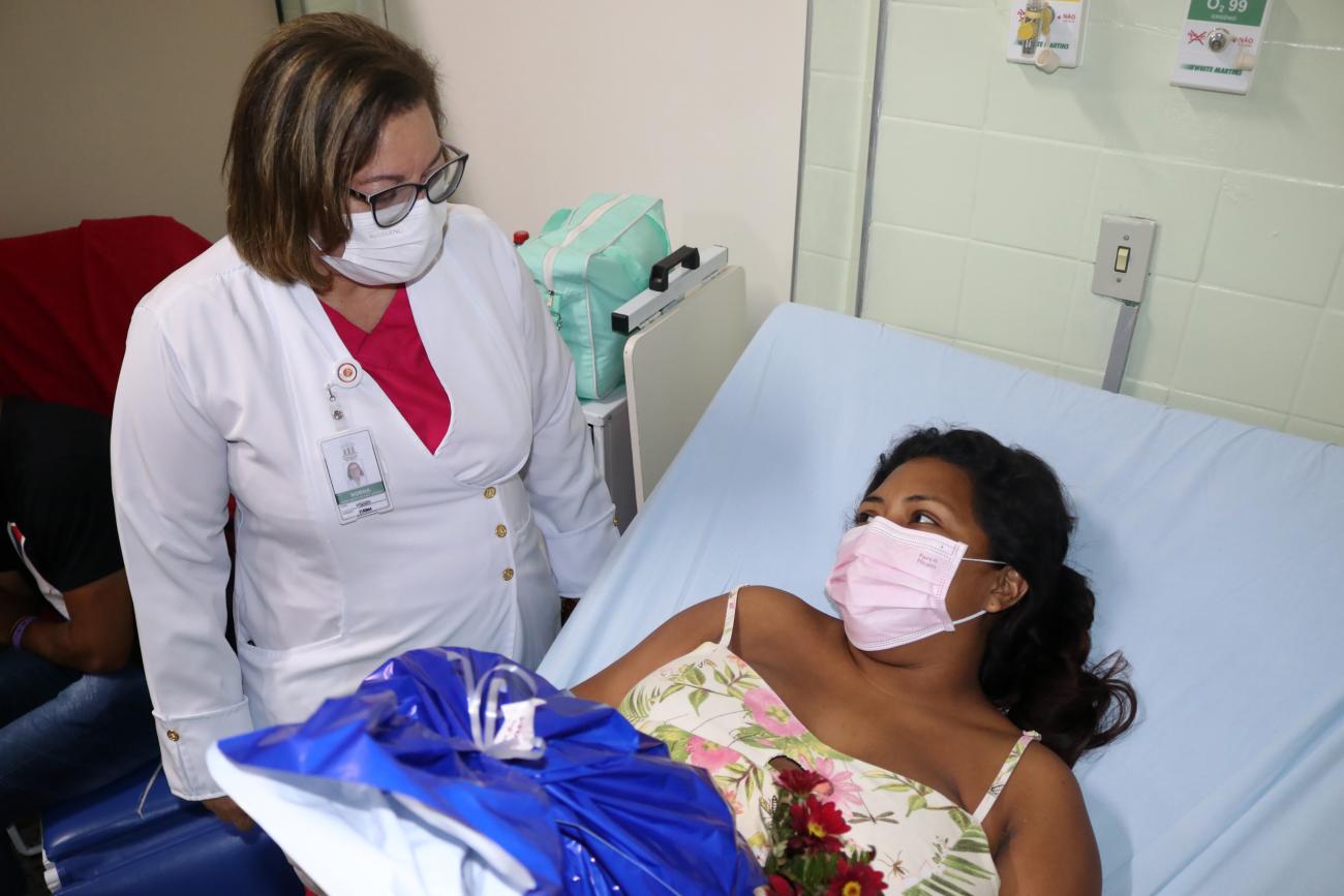 A diretora Técnica Assistencial da Santa Casa, Norma Assunção, na entrega do brinde à parturiente Gleice Sozar, nesta segunda, 10Com ações desde a sexta-feira (7), a Santa Casa do Pará encerrou, na manhã desta segunda-feira (10), a programação especial do Dia das Mães, com um culto ecumênico na capela do hospital e orientações às usuárias. O encerramento do evento foi na maternidade do hospital com a distribuição de brindes para as mulheres que deram à luz, no Dia das Mães (9).