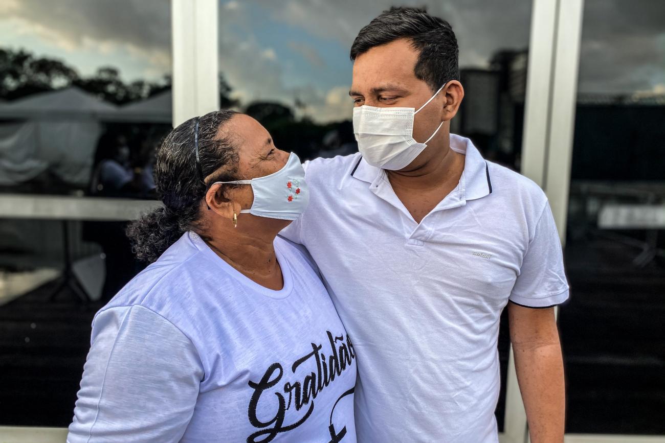A idosa conta que, antes da internação do neto, não imaginava que os pacientes recebiam esse cuidado dentro no Hospital de Campanha. “Eu tinha uma imagem muito distorcida do que é isso aqui. O meu neto está saindo daqui com vida e bem. Se não fosse pelo Hangar, com certeza, isso não aconteceria. O cuidado, o respeito com a família. Isso é real e eu mudei minha percepção. Muito obrigada!”.