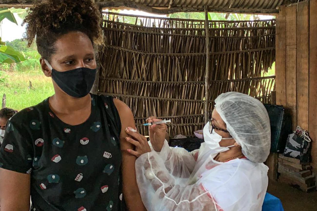Moradora da Ilha do Chicote, em Altamira, é imunizada conta a Covid-19 por técnica do 10º Centro Regional da Sespa Equipes do 10º Centro Regional da Secretaria de Estado de Saúde Pública (Sespa) participaram, neste sábado (5), da ação social integrada na comunidade ribeirinha Ilha do Chicote, no rio Xingu, distante quatro horas de Altamira, no sudoeste do estado. Mais de 300 pessoas foram atendidas, vacinadas contra a Covid-19 e, ainda, submetidas a testes para detecção de coronavírus e de malária.