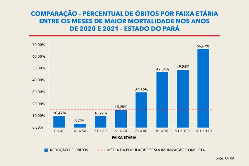 A vacinação contra Covid-19 já mostra bons resultados no Pará, com a queda de mortes entre idosos acima de 70 anosUm estudo realizado pela Universidade Federal Rural da Amazônia (Ufra) constatou que o avanço da imunização contra a Covid-19 no Pará resultou na queda de 45% no número de óbitos de idosos acima de 70 anos. Os dados foram divulgados durante a reunião do Comitê Científico da Secretaria de Estado de Saúde Pública (Sespa), na noite desta quinta-feira (17). O Comitê avalia o cenário da pandemia no Pará.