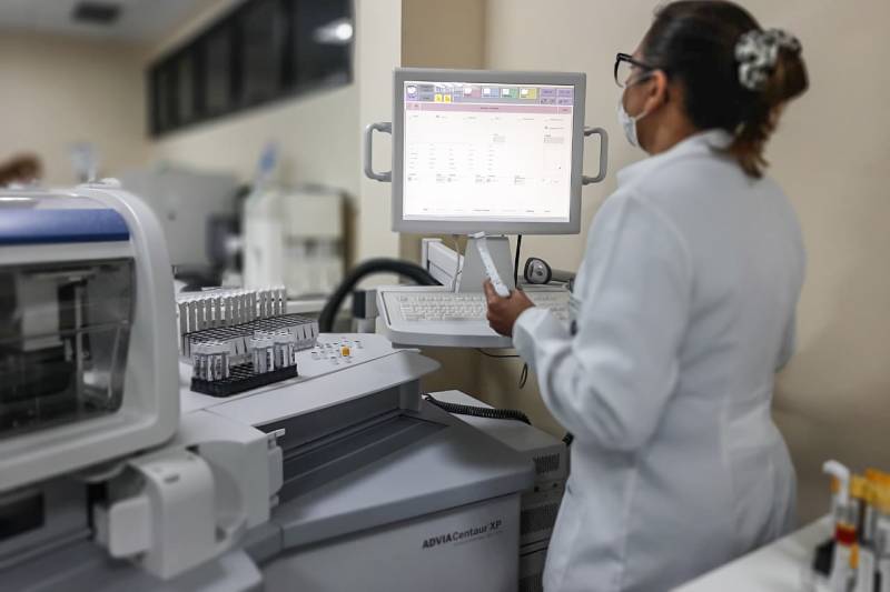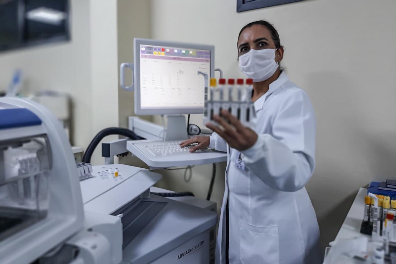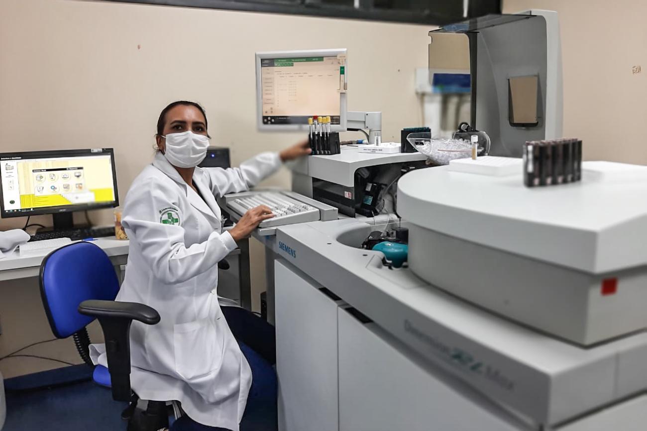 Em média, no mês, o Laboratório do hospital realiza 40 mil exames. Na Covid, número chegou a quase 50 mil.
