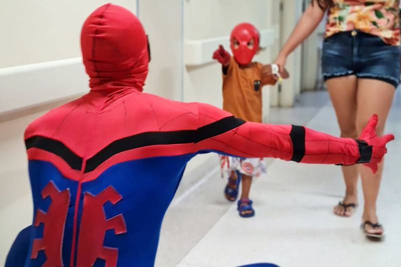 O pequeno paciente ficou diante do Homem-Aranha, seu personagem preferido em filmes e histórias em quadrinhos. Entre sorrisos e o gestual característico do herói, Matheus entrou na brincadeira e se tornou personagem das próprias aventuras. Por trás da máscara e da roupa colorida estava o empresário Fábio Evilázio, que há dez anos se dispõe a levar alegria às crianças em tratamento contra o câncer.