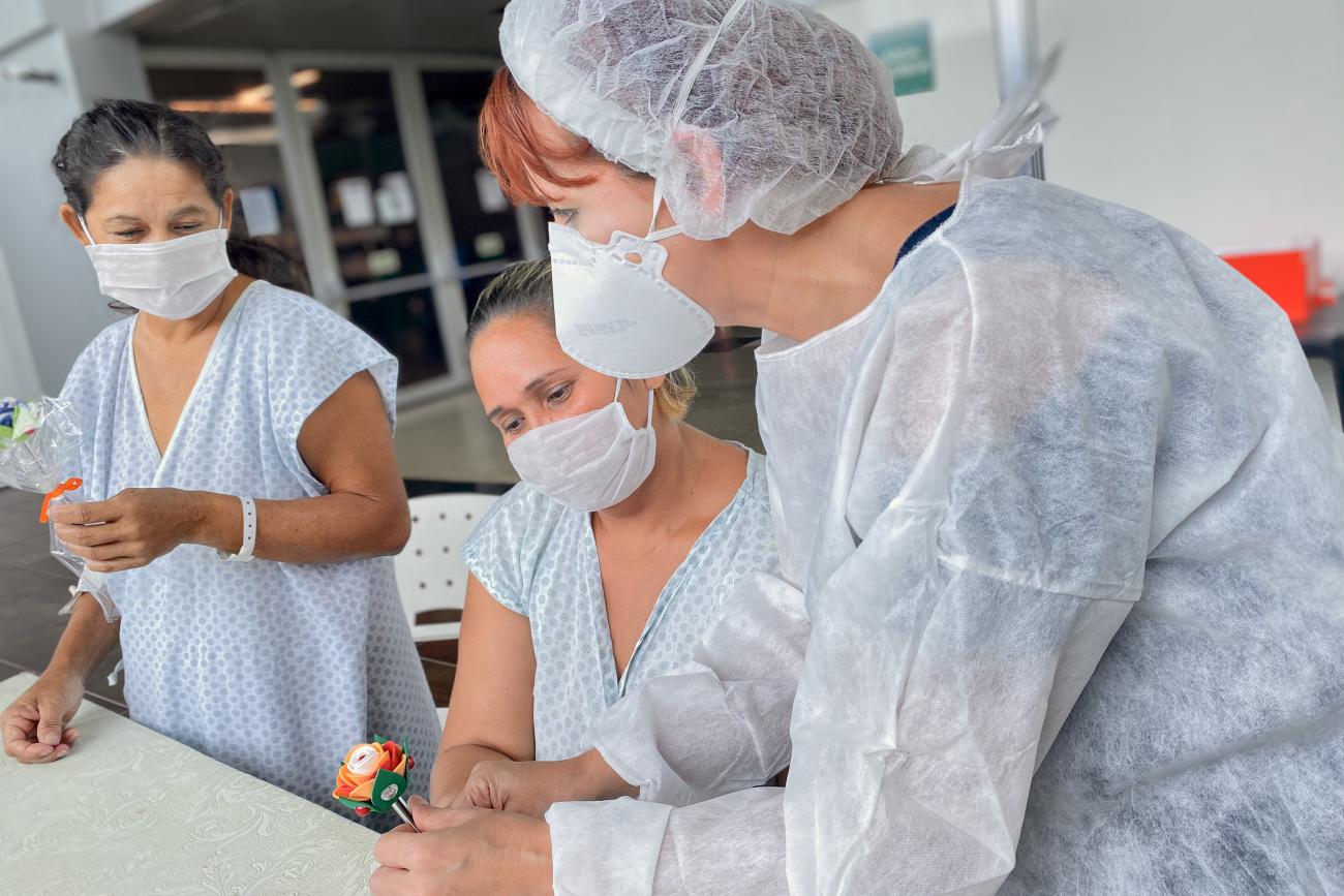 Pacientes durante a oficina de artesanato“Toda a atuação dentro do Hospital de Campanha é voltada para o bem-estar e segurança do paciente. Essa é mais uma atividade que comprova isso e, com certeza, impactará na experiência de vida quando tiverem alta”, diz a diretora assistencial do hospital, Josieli Ledi.