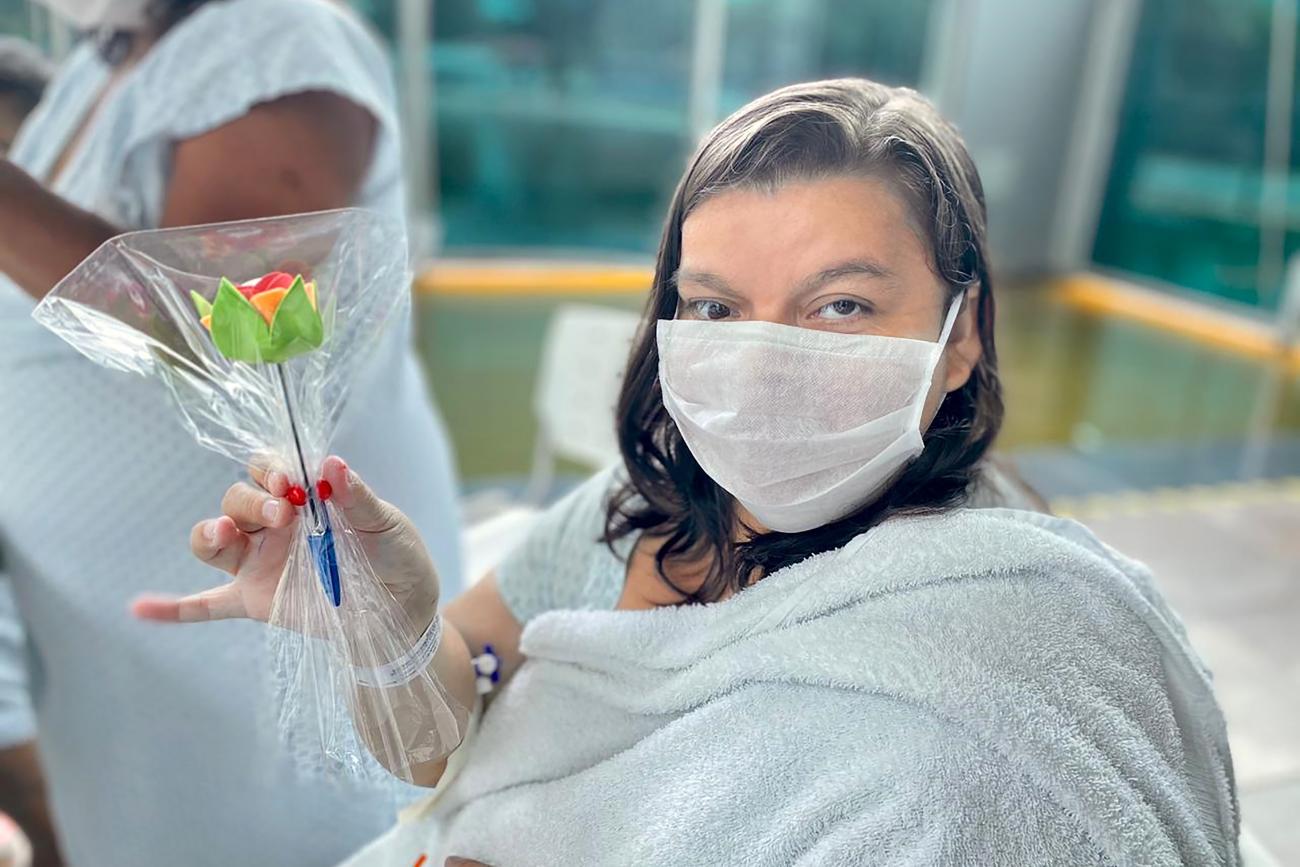 Merivalda Leão mostrando a flor que criou durante a oficinaOutra paciente que acompanhou a oficina foi Merivalda Leão, 36, vinda de Goianésia, no interior do Pará. Internada há quatro dias e com quadro de ansiedade, ela conta que a atividade cooperou para a melhora no humor. “Eu estava bem triste. Esse medo da incerteza é horrível. Por mais que a gente receba todo o cuidado, o carinho desses profissionais, existe o sentimento do medo porque essa doença é algo que não podemos controlar. Então, participar da atividade me deixou mais alegre”, comenta.