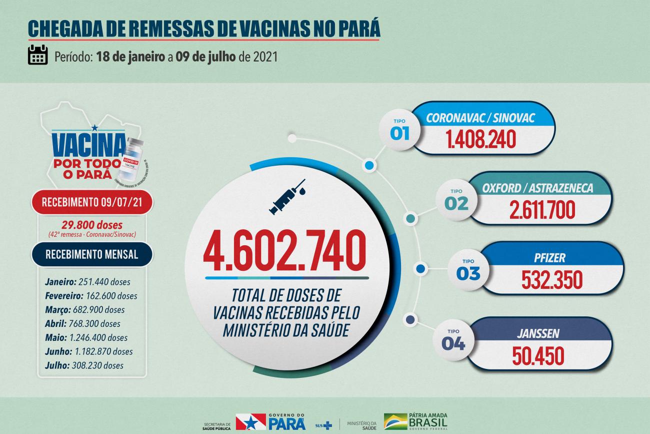 O Pará recebeu na tarde desta quinta-feira (8) mais uma remessa de vacinas contra a Covid-19. São 74.880 doses da Pfizer. Até o momento o Pará recebeu do Ministério da Saúde 4.572.940 de doses, sendo 1.378.440 da CoronaVac, 2.611.700 da Oxford/AstraZeneca, 532.350da Pfizer e 50.450 da Janssen.