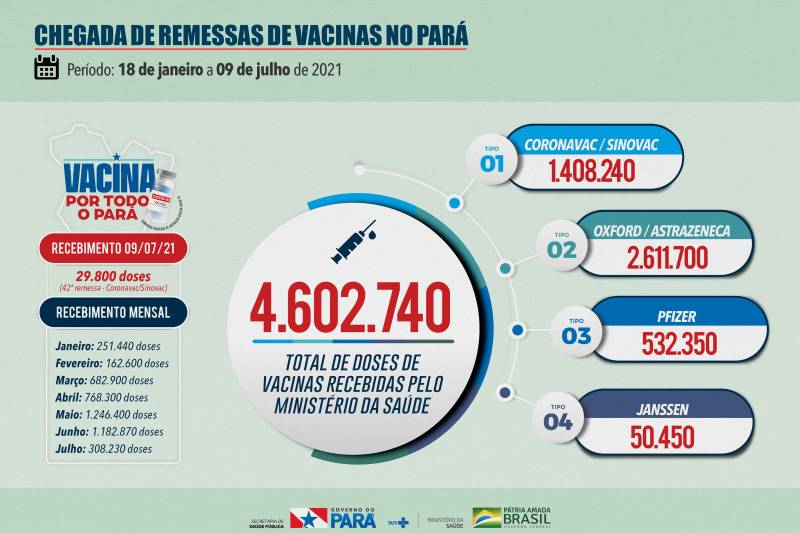 “O Pará segue avançando na vacinação contra a Covid-19 e a cada chegada de remessas nós temos a oportunidade de vacinar mais paraenses. Dessa forma, é importante também que a população faça a sua parte e não deixe de tomar a segunda dose. Somente assim vamos evitar os casos graves da doença”, explica o Secretário de Saúde do Estado, Rômulo Rodovalho.