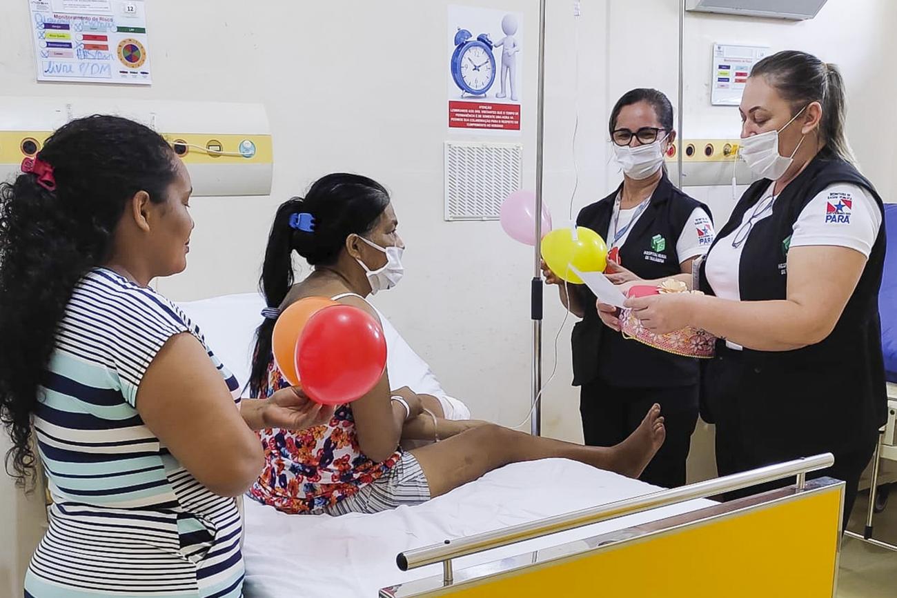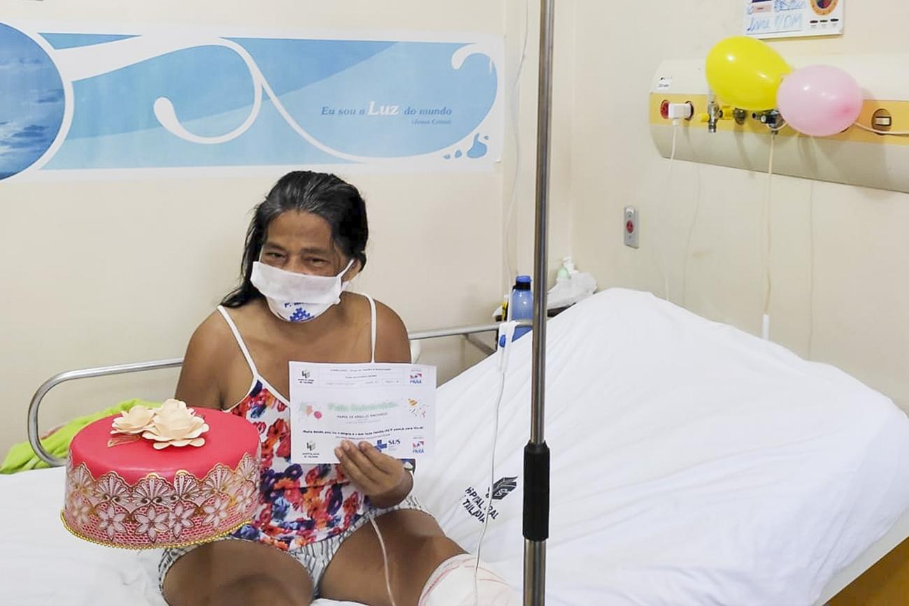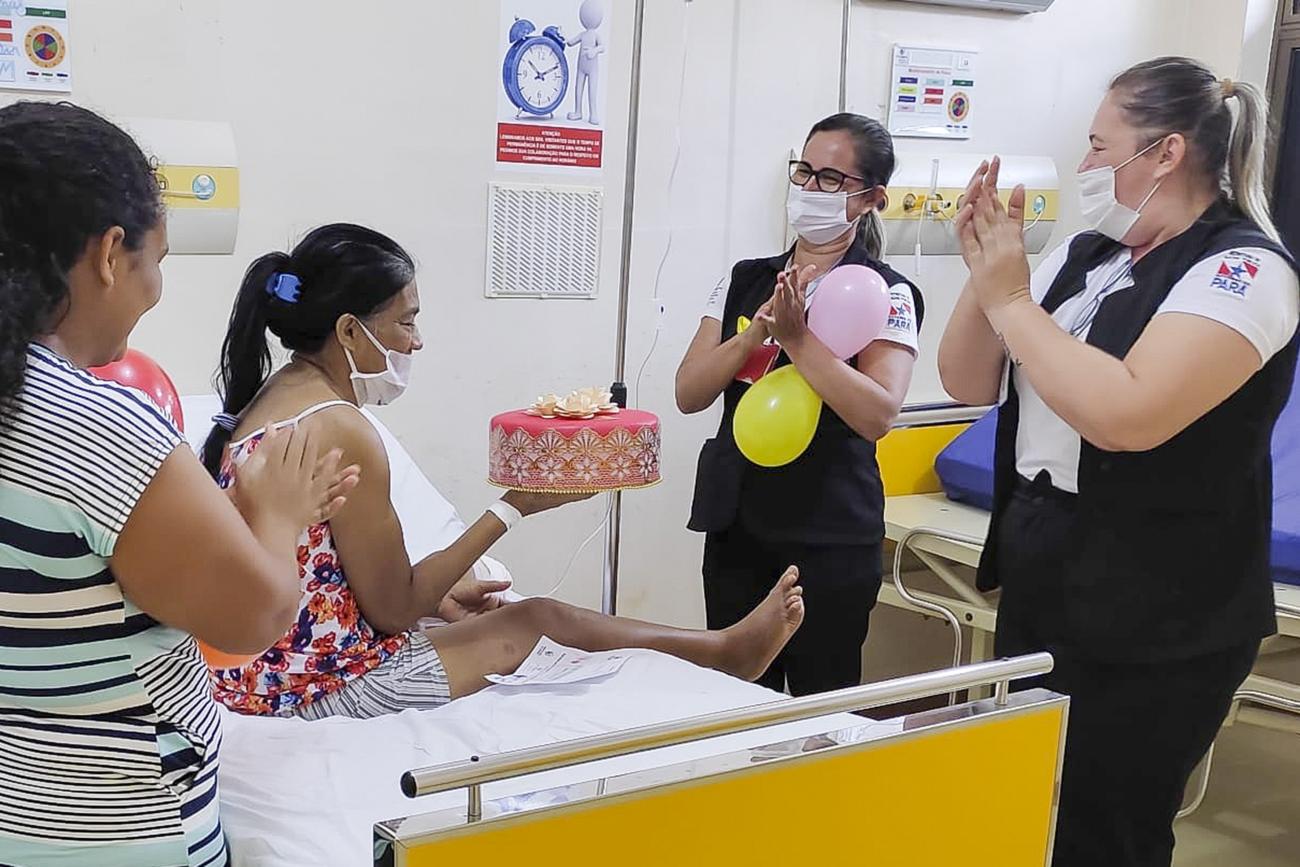 Internada no Hospital Geral de Tailândia (HGT), na mesorregião do nordeste paraense, desde o dia 10 deste mês, a usuária Maria de Araújo Machado, teve a grata surpresa de ganhar comemoração pelos seus 54 anos, festejados no último dia 12. “Agradeço o carinho de vocês. Hoje eu já chorei muito, mas agora estou me sentido muito alegre, até o desconforto passou. Muito linda essa ação”, disse ela para as voluntárias do Grupo de Trabalho de Humanização (GTH), responsáveis pela ação que levou a homenageada às lágrimas de tanta emoção e agradecimento.
