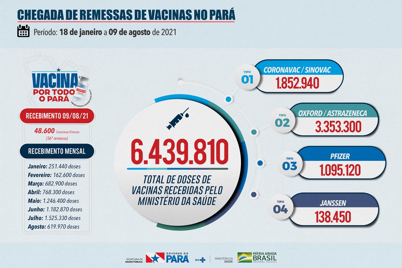 O Pará recebeu, na tarde desta segunda-feira (9), a 56ª remessa de vacinas contra a Covid-19, enviada pelo Ministério da Saúde (MS). São 48.600 mil doses da Coronavac. Ao todo, o Pará já recebeu 6.439.810 milhões de doses de imunizantes dos quais 1.852.940 foram da CoronaVac/Sinovac; 3.353.300 da Oxford/AstraZeneca; 1.095.120 da Pfizer e 138.450 da Janssen.
